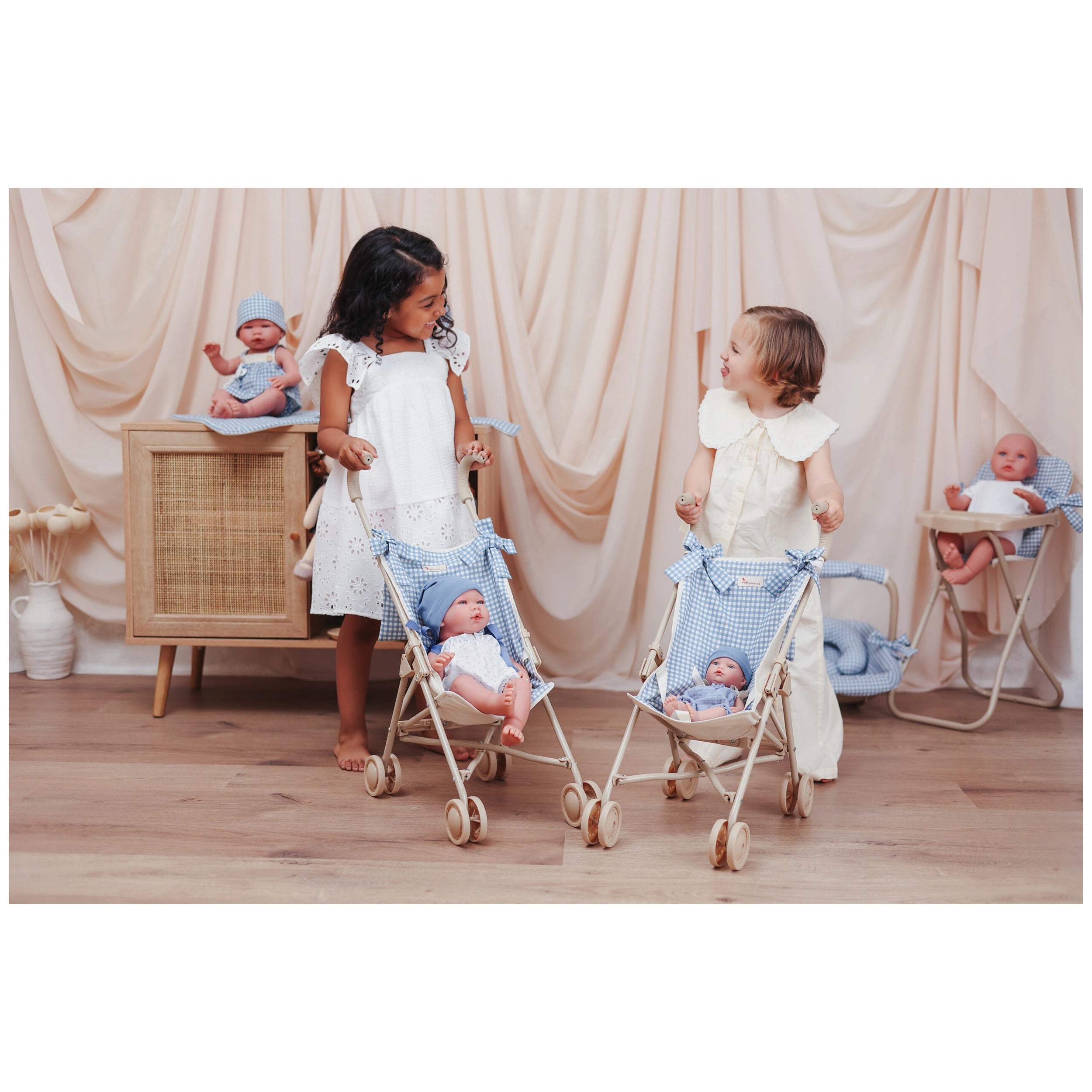ASI Dolls - ASI Dolls-Dreams-Buggy Wir präsentieren den ASI Dolls Complements für Asi Doll - Así Dreams - Noel Collection Buggy mit Tasche, eine wunderbare Ergänzung für die Spielzeit jedes Kindes. Dieser wunderschön gestaltete Buggy ist perfekt für Puppen von 30 bis 46 cm und somit ein idealer Begleiter für fantasievolles Spielen. Mit viel Sorgfalt gefertigt, verbessert dieser Buggy nicht nur das Spielerlebnis, sondern fördert auch die Pflegefähigkeiten, während Kinder in Rollenspiele eintauchen. Der Buggy verfügt über eine robuste, beige lackierte Metallkonstruktion, die Langlebigkeit gewährleistet und gleichzeitig ein leichtes Design für einfache Manövrierbarkeit bietet. Mit einer Griffhöhe von etwa 62 cm ist er perfekt für kleine Hände geeignet, sodass Kinder ihre Puppen bequem schieben können. Die beigen Räder und Schaumstoffgriffe bieten einen weichen Halt, was es den Kindern erleichtert, ihre geliebten Puppen auf verschiedenen Abenteuern zu transportieren. Ein herausragendes Merkmal dieses Buggys ist der elegante Baumwollstoff, der mit einem doppelten Stoffrüschchen verziert ist und einen Hauch von Raffinesse verleiht. Diese Liebe zum Detail verbessert nicht nur die ästhetische Anziehungskraft, sondern stellt auch sicher, dass der Buggy aus weichen, langlebigen Materialien gefertigt ist, die den Strapazen des Spiels standhalten können. Die passende Tasche ist perfekt zum Verstauen aller notwendigen Accessoires und ermöglicht es den Kindern, alles, was sie für einen Tag mit ihren Puppen benötigen, mitzunehmen. Der Buggy wurde mit Blick auf Bequemlichkeit entworfen und lässt sich leicht zusammenklappen, was ihn zu einer platzsparenden Lösung für die Aufbewahrung und den Transport macht. Eltern werden die Praktikabilität dieses Merkmals zu schätzen wissen, da es eine schnelle Einrichtung und Abbau ermöglicht, sei es zu Hause oder unterwegs. Die hochwertigen Oberflächen und die solide Konstruktion sorgen dafür, dass dieser Buggy über Jahre hinweg ein geschätzter Teil der Spielzeit sein wird. Sicherheit hat oberste Priorität, und dieses Produkt wurde mit diesem Gedanken entworfen. Es wird für Kinder ab drei Jahren empfohlen, da es kleine Teile enthält, die eine Erstickungsgefahr darstellen könnten. Der Zusammenbau sollte von einem Erwachsenen durchgeführt werden, um sicherzustellen, dass der Buggy sicher zusammengebaut ist und während der Spielzeit ein beruhigendes Gefühl vermittelt. Zusammenfassend ist der ASI Dolls Complements für Asi Doll - Así Dreams - Noel Collection Buggy mit Tasche eine fantastische Wahl für Kinder, die fantasievolles Spielen lieben. Mit seinem stilvollen Design, praktischen Funktionen und dem Fokus auf Sicherheit wird dieser Buggy sowohl Kinder als auch Eltern begeistern. Verpassen Sie nicht die Gelegenheit, das Spielerlebnis Ihres Kindes zu verbessern – bestellen Sie noch heute den Noel Collection Buggy und sehen Sie zu, wie ihre Kreativität erblüht!