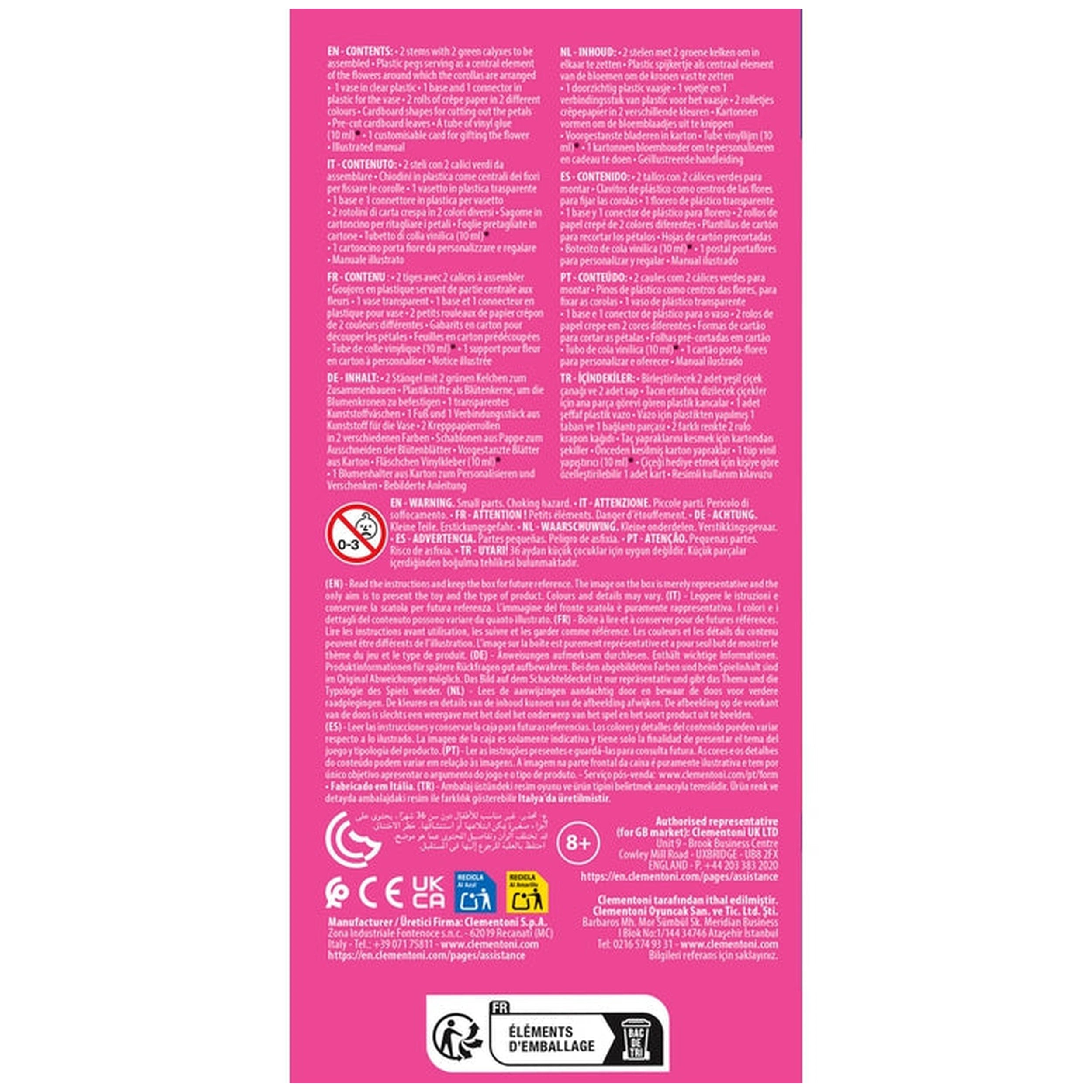 Clementoni - Create-Your-Flowers-Narcissus - Bastelset Präsentieren Sie das Clementoni - IDEA - Create Your Flowers - Narcissus Bastelset, ein bezauberndes und innovatives Kreativset, das für junge Künstler ab 7 Jahren konzipiert wurde. Dieses einzigartige Set bietet eine ansprechende Möglichkeit für Kinder, ihre künstlerischen Talente zu erkunden und gleichzeitig die Schönheit der Natur kennenzulernen. Mit der Möglichkeit, zwei atemberaubende Narzissenblumen zusammenzustellen und zu personalisieren, bietet dieses Produkt ein bereicherndes Erlebnis, das Kreativität mit praktischem Basteln verbindet. Das Set enthält alles, was benötigt wird, um wunderschöne Blumen zu kreieren, darunter Stiele, farbige Blütenblätter und Kronen, die leicht zusammengebaut werden können. Kinder können ihrer Fantasie freien Lauf lassen, indem sie aus einer Vielzahl von Farben wählen, um ihre Blumen zu dekorieren, was endlose Anpassungsmöglichkeiten bietet. Der enthaltene Blumenhalter verleiht einen zusätzlichen Charme und ermöglicht es den Kindern, ihre Kreationen stolz zu präsentieren. Diese praktische Aktivität fördert nicht nur die Kreativität, sondern verbessert auch die Feinmotorik, während die Kinder mit den verschiedenen Komponenten umgehen. Ein herausragendes Merkmal des Clementoni Create Your Flowers Sets ist die personalisierte Blumenkarte, die im Set enthalten ist. Diese durchdachte Ergänzung ermöglicht es den Kindern, ein einzigartiges Geschenk für Freunde oder Familie zu erstellen, was es zu einer perfekten Wahl für Geburtstage, Feiertage oder besondere Anlässe macht. Der Akt des Bastelns und Personalisierens eines Geschenks vermittelt ein Gefühl von Erfolg und Stolz und ermutigt die Kinder, ihre Gefühle durch Kunst auszudrücken. Entwickelt, gestaltet und produziert in Italien, verkörpert dieses Bastelset Qualität und Kreativität. Die Liebe zum Detail im Design sorgt dafür, dass jede Komponente sicher und einfach zu verwenden ist, was es für junge Bastler geeignet macht. Die kompakten Abmessungen der Box (10 x 18,7 x 4 cm) erleichtern die Aufbewahrung und den Transport, sodass kreativer Spaß zu Hause oder unterwegs möglich ist. Clementoni ist bekannt für sein Engagement für spielerisches Lernen, und das Create Your Flowers Set ist da keine Ausnahme. Durch die Teilnahme an dieser kreativen Aktivität genießen die Kinder nicht nur das Basteln, sondern lernen auch die natürliche Welt und die Bedeutung von Blumen in unserem Ökosystem kennen. Dieses Set dient als hervorragende Einführung in die Freuden des Gärtnerns und der Naturwertschätzung und weckt Neugier und Liebe zur Umwelt. Verpassen Sie nicht die Gelegenheit, Kreativität und Vorstellungskraft in Ihrem Kind zu inspirieren. Das Clementoni - IDEA - Create Your Flowers - Narcissus Bastelset ist das perfekte Geschenk für angehende Künstler. Bestellen Sie Ihres noch heute und beobachten Sie, wie Ihr Kind zu einem kreativen Genie heranwächst, das wunderschöne Blumen gestaltet, die ihre einzigartige Persönlichkeit widerspiegeln!