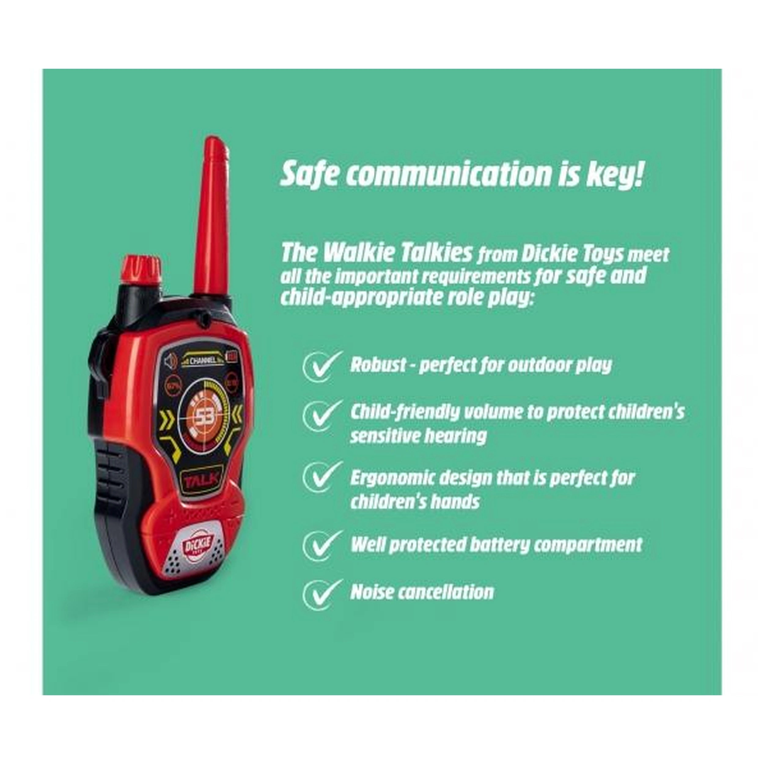 In summary, the Dickie Walkie Talkie Fun with Noise Cancellation 2.4 GHz is an essential accessory for any young explorer. With their engaging design, user-friendly features, and robust construction, these walkie-talkies promise hours of fun and adventure. Encourage your child's imagination and communication skills by adding these fantastic walkie-talkies to their playtime arsenal. Don’t miss out on the opportunity to enhance your child's outdoor experiences – order the Dickie walkie-talkies today and watch their adventures come to life!