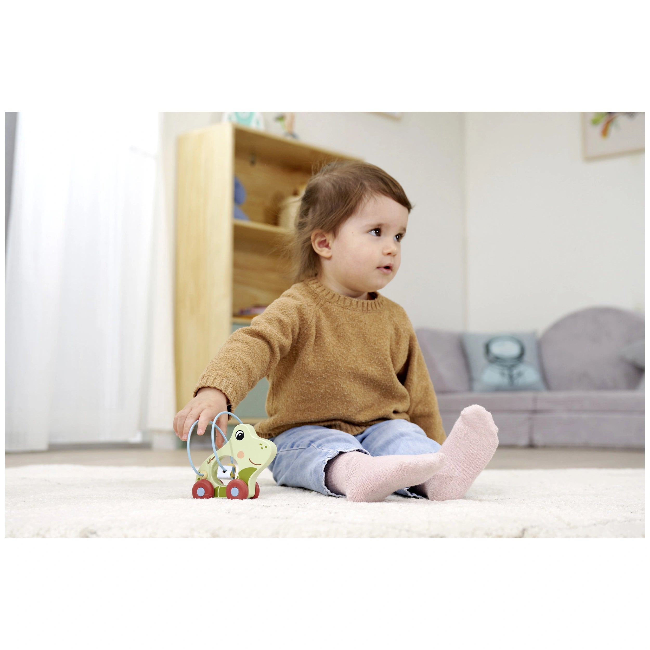 Eichhorn - Schiebefrosch - Babyspielzeug Wir präsentieren den Eichhorn Holzfrosch Schiebe- und Ziehspielzeug, eine bezaubernde Ergänzung für jede Spielzeugsammlung eines Kindes. Mit einer Länge von 11 cm ist dieser charmante Holzfrosch speziell für kleine Hände konzipiert und somit die ideale Wahl für Kleinkinder ab einem Jahr. Hergestellt aus hochwertigem Holz, verspricht der Eichhorn Holzfrosch nicht nur Langlebigkeit, sondern sorgt auch für ein sicheres und angenehmes Spielerlebnis für Ihre Kleinen. Das ergonomische Design des Eichhorn Holzfrosches ermöglicht ein einfaches Greifen und ermutigt Kinder zu aktivem Spiel. Während sie dieses niedliche Spielzeug schieben und ziehen, entwickeln sie wichtige motorische Fähigkeiten und die Hand-Augen-Koordination. Die integrierte Motorikschleife fügt eine zusätzliche Ebene des Spaßes hinzu und ermöglicht es den Kindern, ihre Kreativität zu erkunden, während sie ihre Geschicklichkeit verfeinern. Dieses Spielzeug ist nicht nur eine Quelle der Unterhaltung; es dient auch als wertvolles Werkzeug für die frühkindliche Entwicklung. Eine der herausragenden Eigenschaften des Eichhorn Holzfrosches sind seine Silikonräder. Diese Räder sind so konzipiert, dass sie sanft über verschiedene Oberflächen gleiten, ohne Lärm zu machen oder Spuren zu hinterlassen. Eltern können beruhigt sein, dass ihre Böden und Möbel unversehrt bleiben, während ihre Kinder stundenlang spielen. Dieses durchdachte Designelement macht das Spielzeug sowohl für drinnen als auch für draußen geeignet und bietet Vielseitigkeit für verschiedene Spielumgebungen. Neben seinen praktischen Vorteilen ist der Eichhorn Holzfrosch auch visuell ansprechend. Seine lebendigen Farben und das freundliche Design ziehen die Aufmerksamkeit junger Kinder auf sich, regen ihre Fantasie an und fördern interaktives Spiel. Dieses Spielzeug unterhält nicht nur, sondern stimuliert auch die kognitive Entwicklung, während die Kinder lernen, sich in ihrer Umgebung zurechtzufinden und Ursache und Wirkung durch Spiel zu verstehen. Sicherheit hat für Eichhorn oberste Priorität, und dieses Holzfroschspielzeug bildet da keine Ausnahme. Hergestellt aus ungiftigen Materialien und mit kindersicheren Farben versehen, können Eltern beruhigt sein, dass ihre Kinder mit einem Produkt spielen, das hohen Sicherheitsstandards entspricht. Die robuste Konstruktion sorgt dafür, dass das Spielzeug den Anforderungen des Spiels standhält und somit eine langlebige Ergänzung jeder Spielzeugsammlung darstellt. Zusammenfassend lässt sich sagen, dass das Eichhorn Holzfrosch Schiebe- und Ziehspielzeug eine ausgezeichnete Investition in die Entwicklung und den Spaß Ihres Kindes ist. Mit seinem ansprechenden Design, praktischen Funktionen und dem Engagement für Sicherheit wird dieses Spielzeug sicher zu einem Favoriten bei Kindern und Eltern gleichermaßen. Verpassen Sie nicht die Gelegenheit, das Spielerlebnis Ihres Kindes zu bereichern – bestellen Sie noch heute den Eichhorn Holzfrosch und beobachten Sie, wie Ihr Kleines in eine Welt voller Spaß und Lernen springt!
