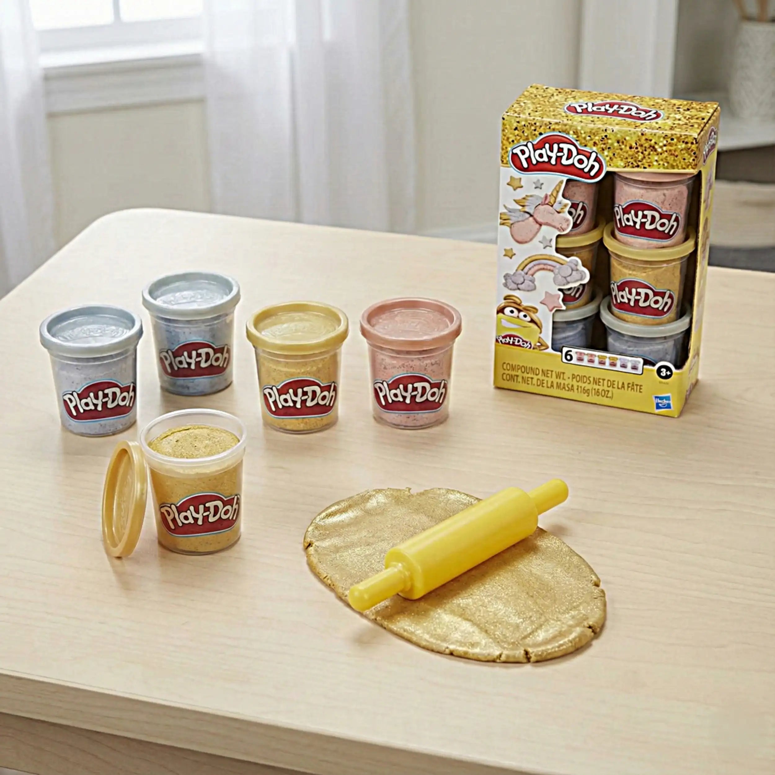 Hasbro - Play Doh Metallics Compound Collection - Knete und Modelliermasse Präsentieren Sie die Hasbro Play Doh Metallics Compound Collection, ein lebhaftes und fantasievolles Set, das darauf ausgelegt ist, die Kreativität von Kindern jeden Alters zu inspirieren. Diese außergewöhnliche Kollektion, identifiziert durch die Produktnummer E9433, umfasst eine Auswahl an metallischer Modelliermasse, die gewöhnliches Spielen in außergewöhnliche künstlerische Abenteuer verwandelt. Mit ihrer hochwertigen Formulierung ist dieses Play Doh Set perfekt für kleine Hände und große Vorstellungen und somit ein ideales Geschenk für Geburtstage, Feiertage oder besondere Anlässe. Die Play Doh Metallics Compound Collection enthält sechs Töpfe schimmernder Plastilin in atemberaubenden Farben wie Roségold, Silber und Gold. Jeder Topf ist mit einer weichen, formbaren Masse gefüllt, die leicht zu modellieren und zu formen ist, sodass Kinder filigrane Designs und fantasievolle Skulpturen erschaffen können. Der metallische Glanz verleiht jeder Kreation eine einzigartige Note, wodurch es perfekt ist, um alles von funkelndem Schmuck bis hin zu glitzernden Kreaturen zu gestalten. Diese Kollektion ermutigt Kinder, ihre künstlerischen Fähigkeiten zu erkunden, während sie ihre Feinmotorik und Hand-Augen-Koordination entwickeln. Neben den lebhaften Farben enthält das Set eine praktische Walze, die das Modelliererlebnis verbessert. Dieses Werkzeug ermöglicht es Kindern, die Knete mühelos zu glätten und zu formen, was endlose Möglichkeiten für ihre Kreationen bietet. Ob sie eine flache Oberfläche für einen Kuchen ausrollen oder detaillierte Muster erstellen, die Walze ist ein unverzichtbares Zubehör, das den Spaß erhöht. Die Kombination aus der Walze und der metallischen Knete stellt sicher, dass jedes Kind seine Kreativität entfalten und seine fantasievollen Ideen zum Leben erwecken kann. Sicherheit hat für Hasbro oberste Priorität, und die Play Doh Metallics Compound Collection ist da keine Ausnahme. Die Knete ist ungiftig und sicher für Kinder, sodass Eltern beruhigt sein können, während ihre Kinder kreativ spielen. Die leicht zu reinigende Formel sorgt dafür, dass jedes Durcheinander schnell beseitigt werden kann, was es zu einer unkomplizierten Option für Eltern macht. Diese Kollektion bietet nicht nur stundenlange Unterhaltung, sondern fördert auch eine sichere und angenehme Umgebung, in der Kinder sich ausdrücken können. Die Play Doh Metallics Compound Collection ist mehr als nur ein Spielzeug; sie ist ein Tor zur Kreativität und Erkundung. Sie fördert das gemeinsame Spiel, was sie perfekt für Spielverabredungen oder Familienaktivitäten macht. Kinder können zusammenarbeiten, um größere Projekte zu erstellen, Ideen auszutauschen und sich gegenseitig zu inspirieren. Dieser soziale Aspekt des Spiels ist entscheidend für die Entwicklung von Kommunikationsfähigkeiten und Teamarbeit, während sie gleichzeitig Spaß mit der lebhaften metallischen Knete haben. Verpassen Sie nicht die Gelegenheit, die Fantasie Ihres Kindes mit der Hasbro Play Doh Metallics Compound Collection zu entfachen. Dieses Set ist eine fantastische Ergänzung zu jeder Spielzeugsammlung und wird garantiert endlose Stunden kreativen Spaß bieten. Bestellen Sie jetzt und beobachten Sie, wie die Kreativität Ihres Kindes mit jeder farbenfrohen Kreation erblüht!