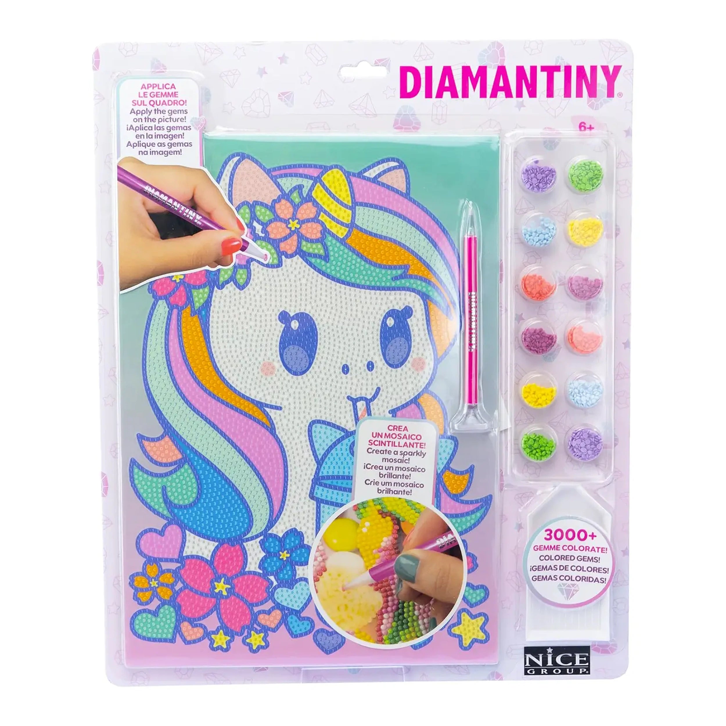 The Diamantiny Crystal Art Design Set features an engaging "Crystal Art, Paint by Numbers" technique that simplifies the process of decorating a beautiful winged unicorn mosaic. Each kit comes with a detailed frame measuring 21x29.5 cm, complete with an adhesive base and color line to guide users in placing over 2000 vibrant crystals. The included applicator pen and wax make it easy to pick up and place each gem precisely, ensuring a satisfying and rewarding crafting experience.