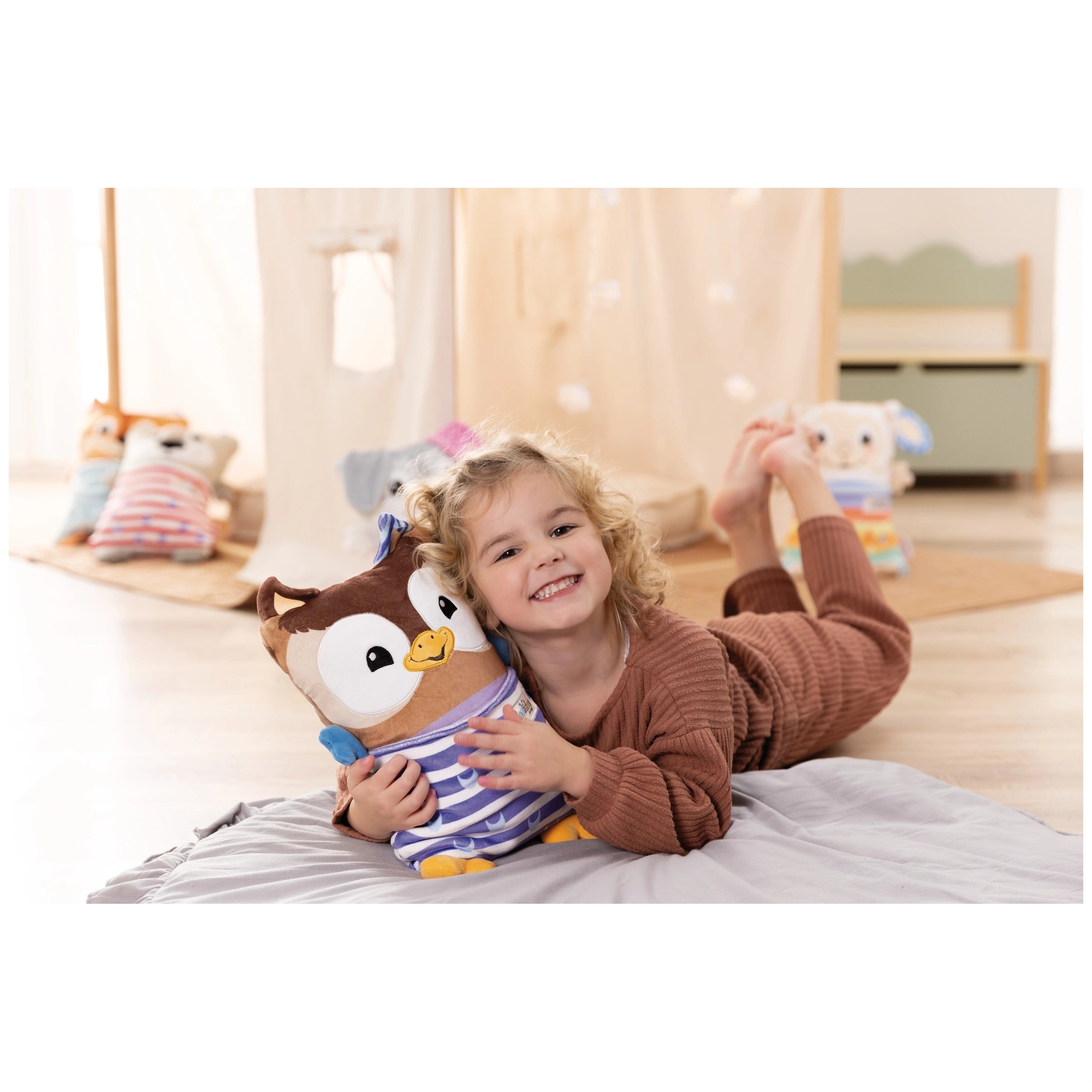 The Cosidoos owl is beautifully designed in a warm brown hue, complemented by a playful striped ear. This aesthetic appeal is not only visually pleasing but also serves a functional purpose, helping children understand the concept of day and night. By incorporating this soft toy into their daily routine, kids can enjoy imaginative play during the day and find comfort at night, making bedtime a more enjoyable experience. The owl's dual functionality promotes a sense of security, allowing children to transition smoothly from playtime to sleep.