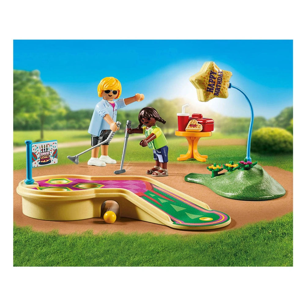 The Playmobil My Life Mini Golf set features three uniquely designed holes, each presenting its own challenges and obstacles. Players can navigate through ramps, curves, and other fun elements that make each round of golf an adventure. The set includes two golf clubs and a selection of colorful golf balls, ensuring that multiple players can join in on the fun. This encourages social interaction and teamwork, making it an ideal choice for playdates or family gatherings.