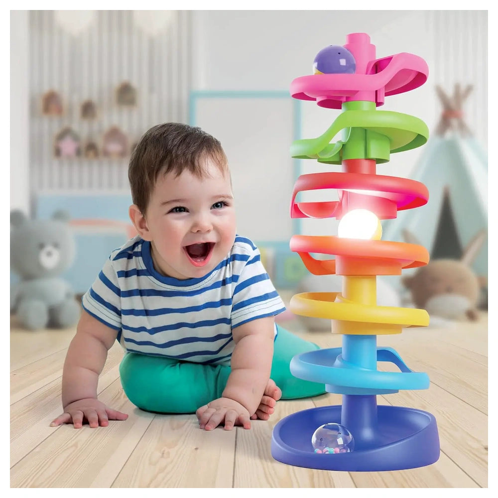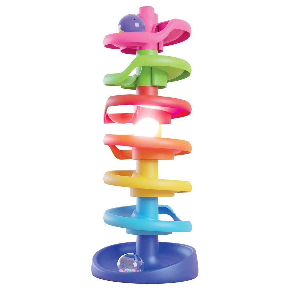 Der Spiral Tower Brightball ist beeindruckende 46 cm hoch und verfügt über sieben leicht zusammenbaubare Ebenen, die eine dynamische spiralförmige Bahn für drei spezialisierte Kugeln schaffen. Jede Kugel ist so gestaltet, dass sie sofortiges sensorisches Feedback bietet: eine bewegungsaktivierte leuchtende Kugel, die leuchtet, eine klare Kugel, die mit Konfetti gefüllt ist und rasselt, und eine lebendige mehrfarbige Kugel. Diese Kombination unterhält nicht nur, sondern hilft auch, wesentliche Fähigkeiten wie Hand-Augen-Koordination und räumliches Bewusstsein zu entwickeln.