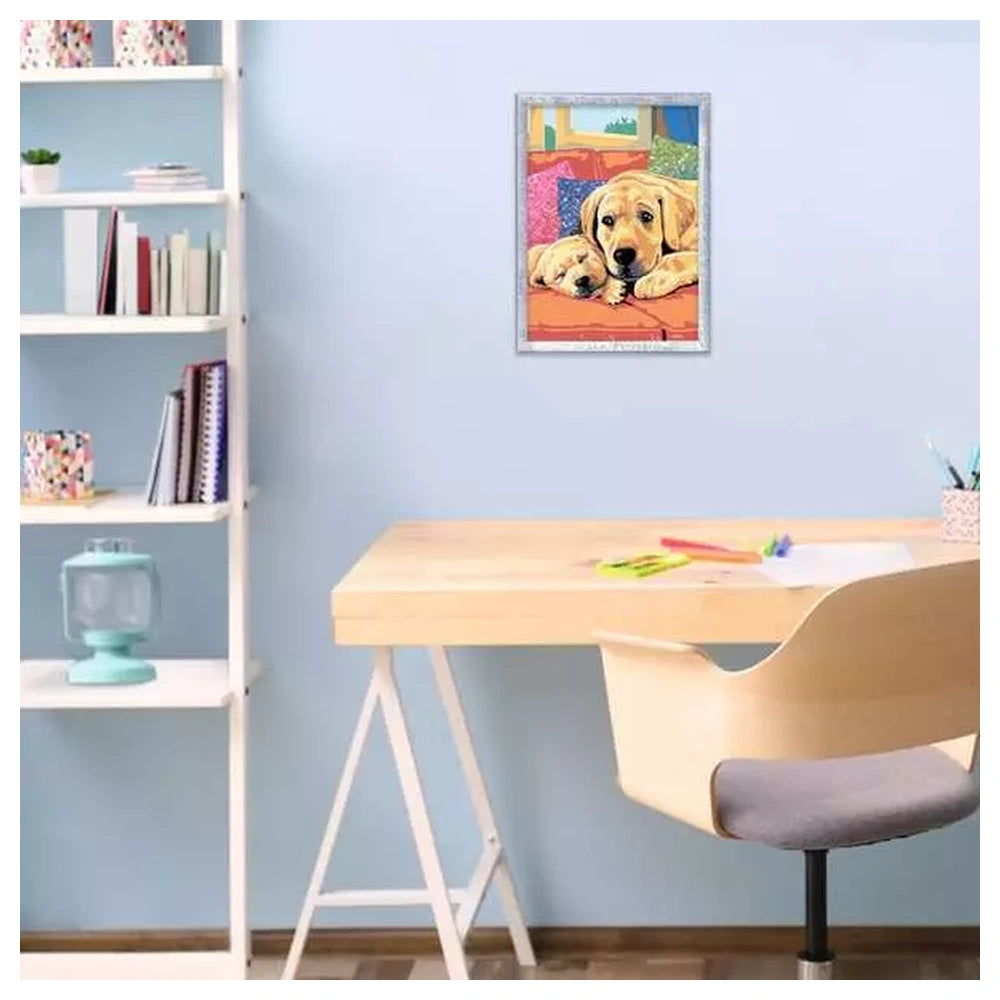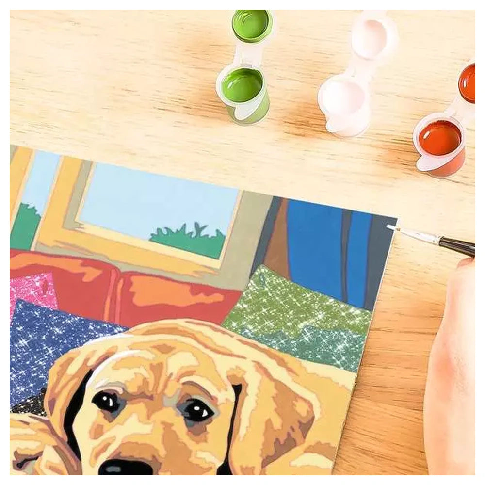 Das Puppy Love Set verfügt über das innovative Color Lines System, bei dem vorgefärbte Ränder den Künstlern helfen, die richtigen Abschnitte leicht zu identifizieren und die passenden Farben auszuwählen. Dieser strukturierte Ansatz sorgt für ein perfektes Ergebnis und stärkt das Selbstvertrauen, während das Bild allmählich Gestalt annimmt. Mit einer Größe von 18,30 x 25,00 cm ist die hochwertige nummerierte Leinwand ideal für fokussierte künstlerische Erkundungen. Das Set enthält alle notwendigen Materialien, wie gebrauchsfertige Acrylfarben und einen Präzisionspinsel, sodass Kinder sofort mit dem Malen beginnen können.
