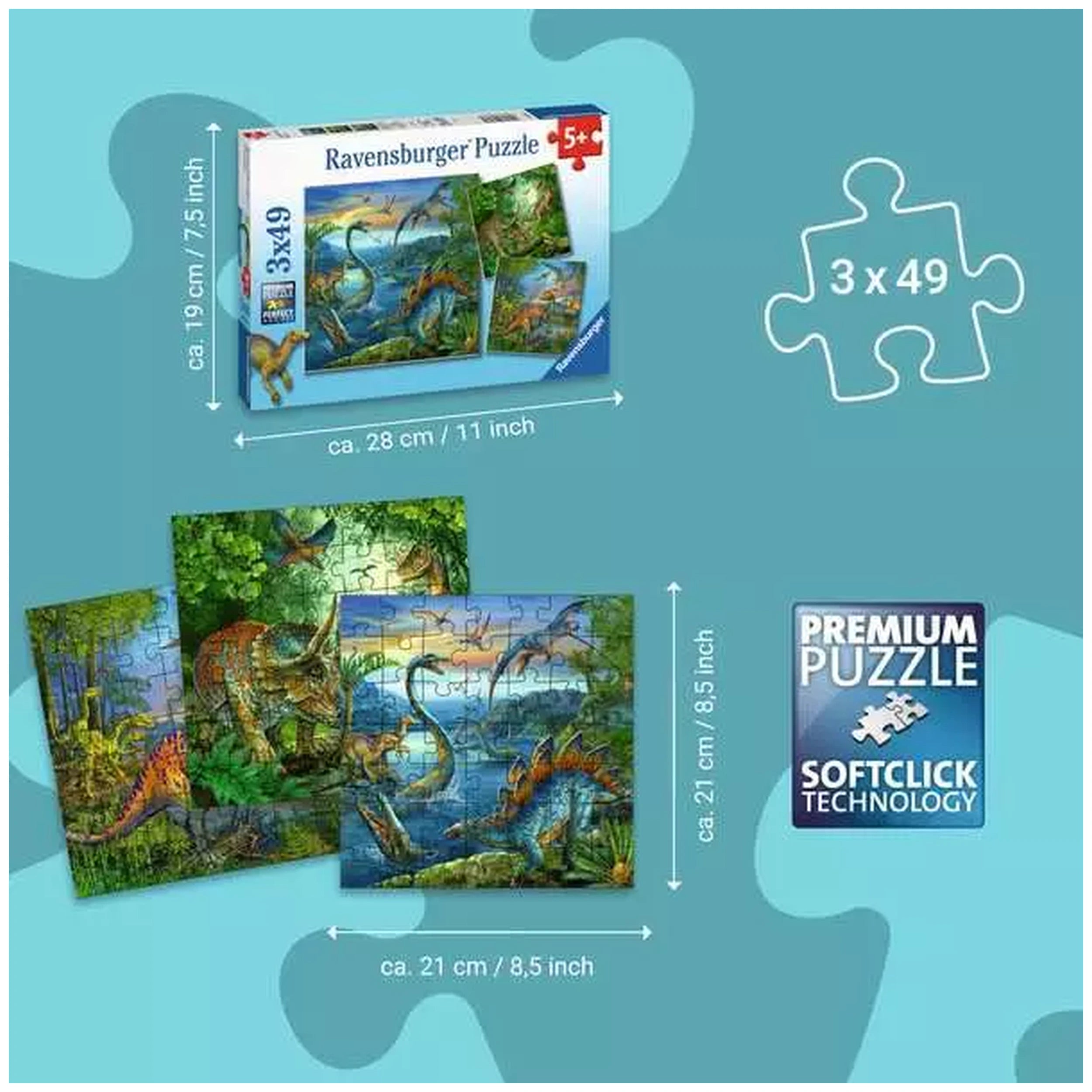 Introducing the Ravensburger Fascination With Dinosaurs Puzzle Set, a delightful collection designed specifically for young dinosaur enthusiasts aged five and up. This engaging set features three individual puzzles, each containing 49 pieces, allowing children to immerse themselves in the prehistoric world while developing essential cognitive skills. With vibrant illustrations and captivating themes, these puzzles are not only entertaining but also educational, making them a perfect addition to any child's playtime.