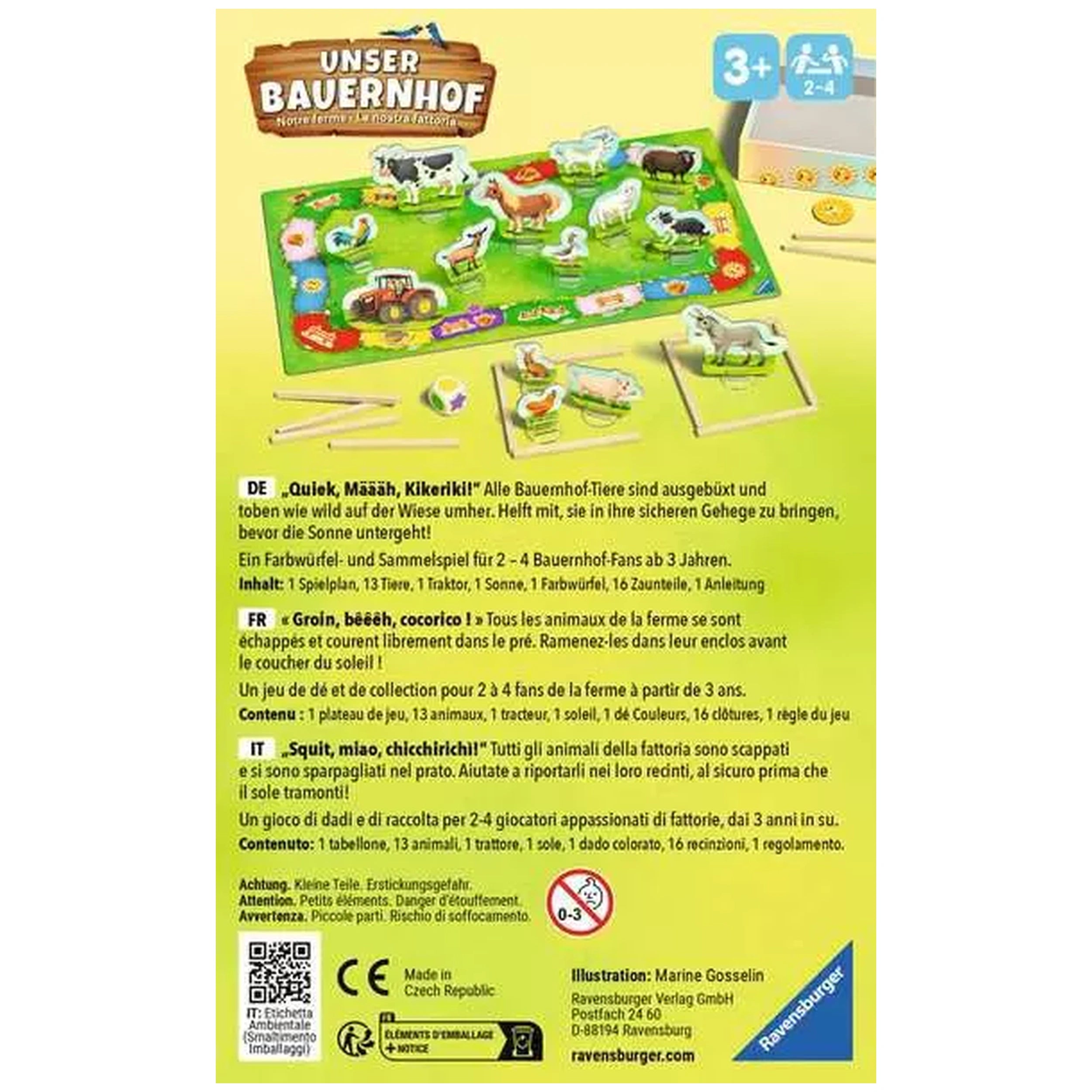 Introducing the Ravensburger - Unser Bauernhof Board Game, a delightful and engaging experience designed for young children aged three and above. This charming game invites players into the vibrant world of a bustling farm, where the sounds of "Muuuuh," "Määäh," and "Kikeriki" fill the air. As the sun rises, players will find themselves in a race against time to help Farmer Frieda round up her mischievous animals that have escaped into the meadow. With multi-language instructions available in German, French, and Italian, this game is perfect for families looking to enjoy quality time together while also enhancing language skills.