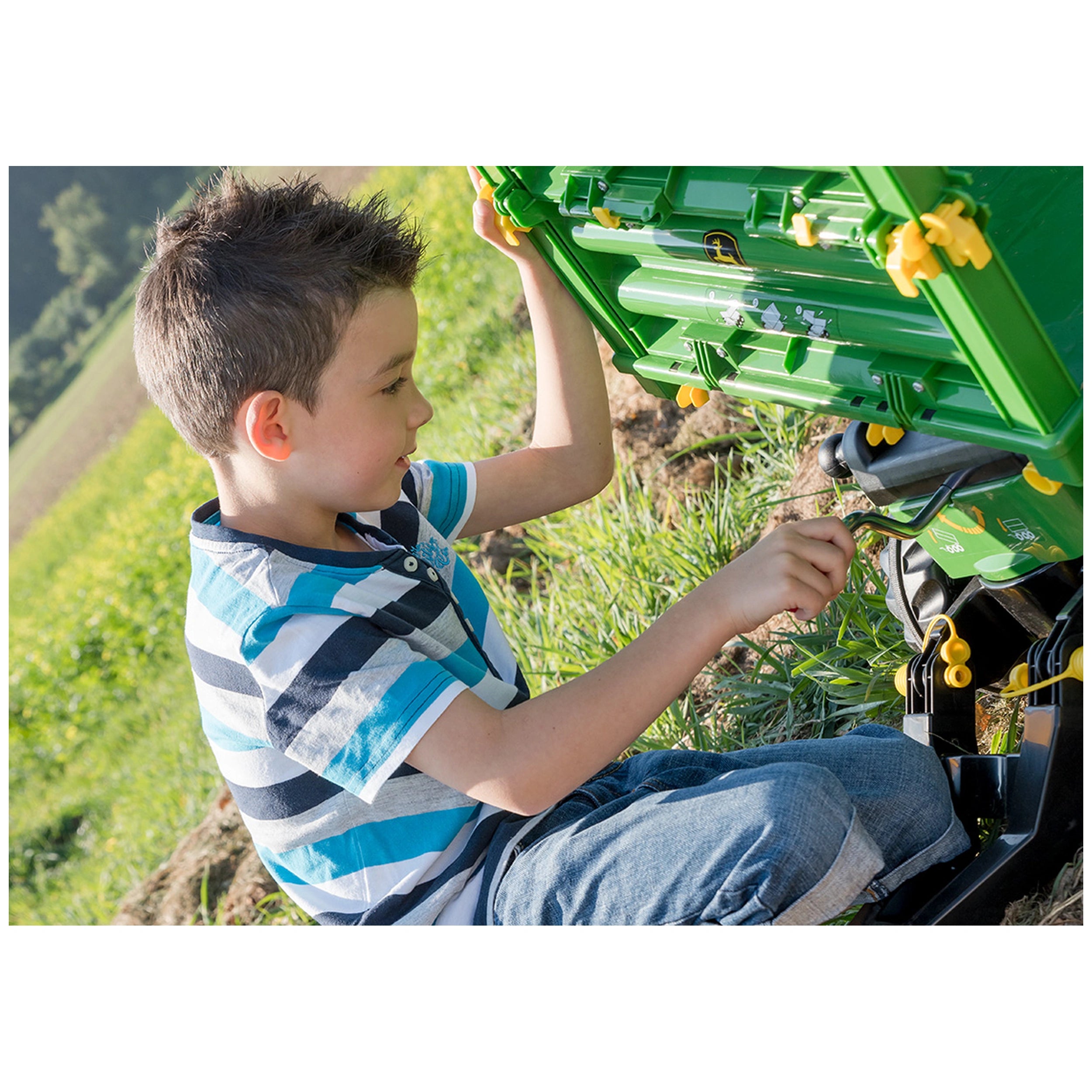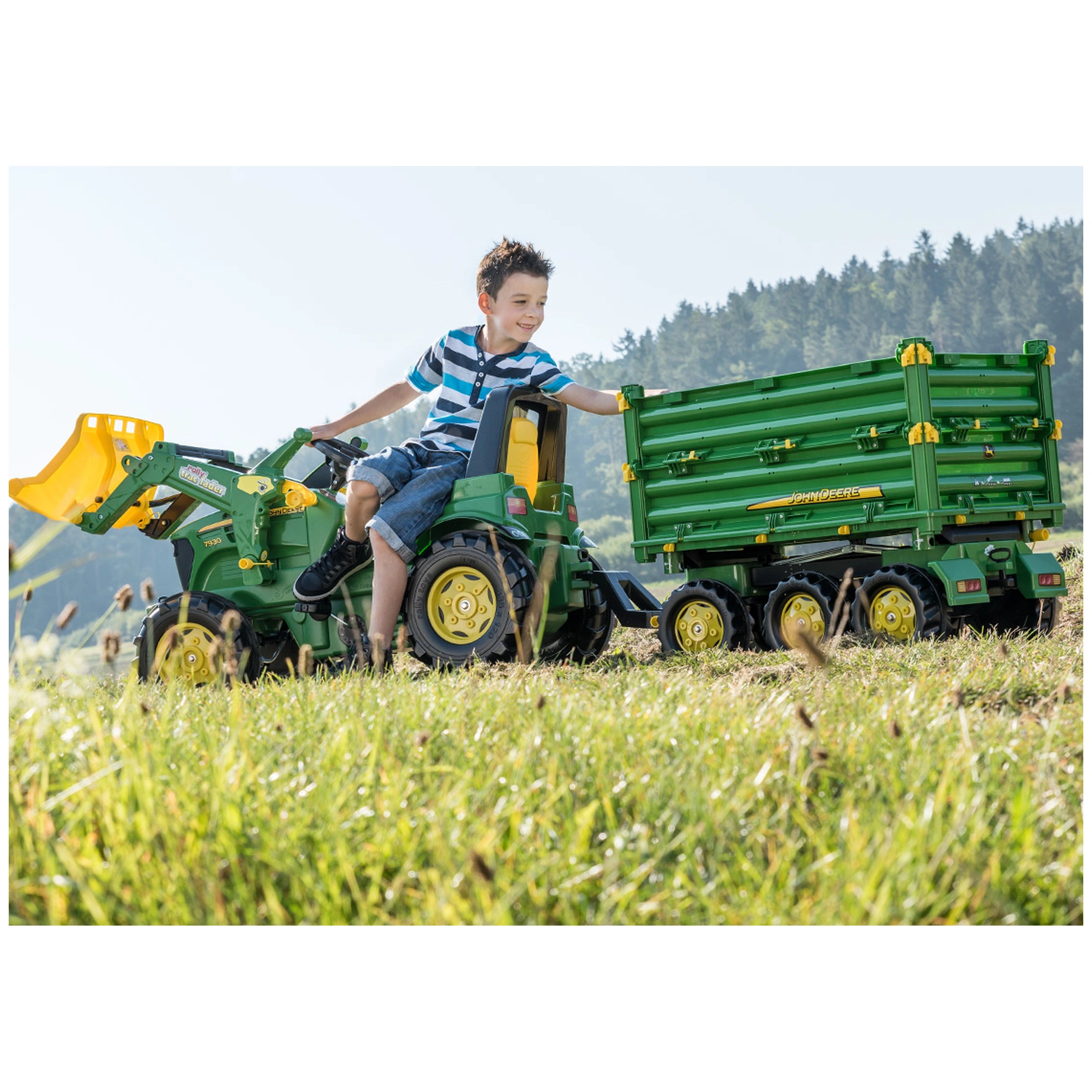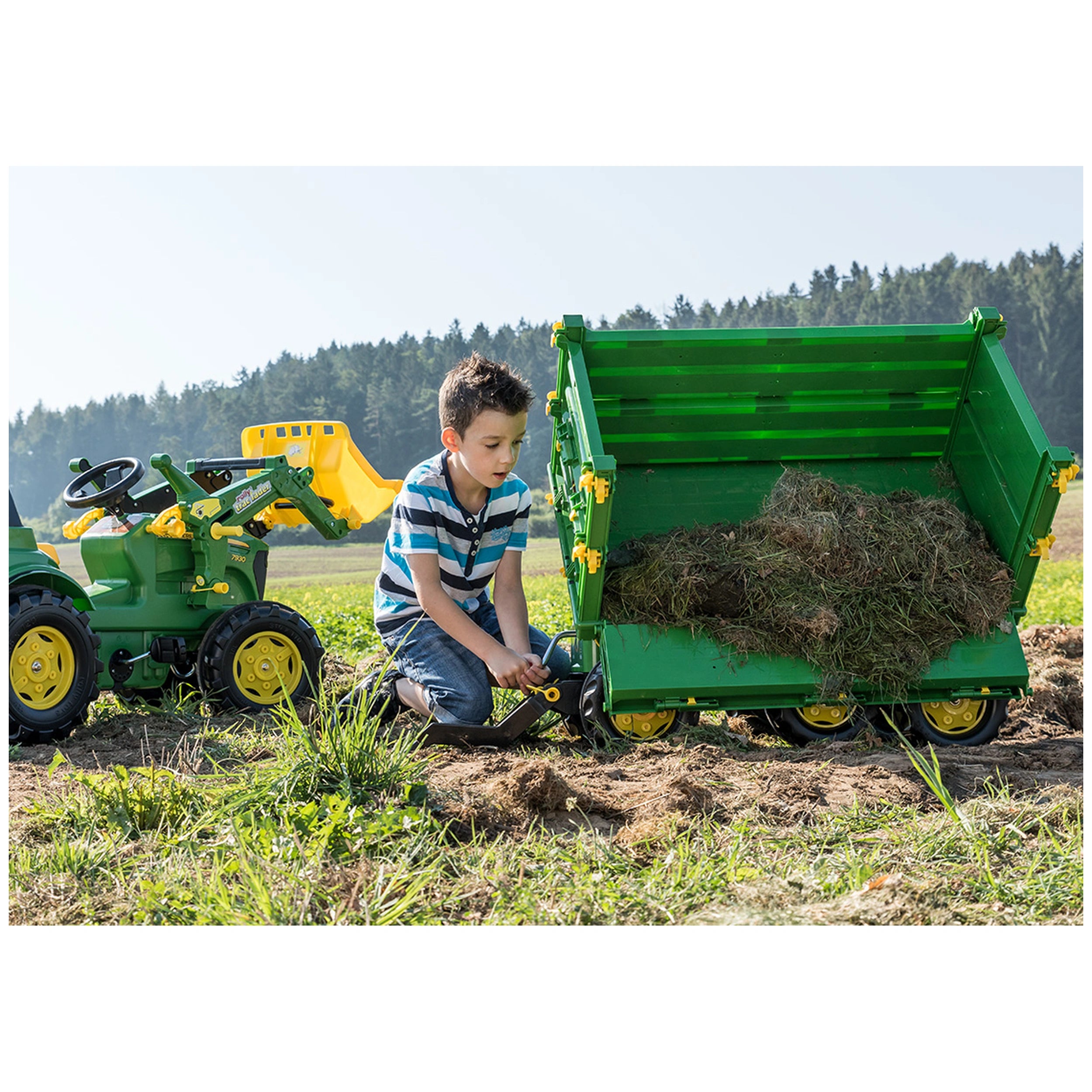 Rolly Toys - RollyMulti Trailer John Deere - Fahrspielzeug Wir präsentieren den Rolly Toys - RollyMulti Trailer John Deere, ein bemerkenswertes Fahrspielzeug, das speziell für Kinder im Alter von 3 bis 10 Jahren entwickelt wurde, die eine Leidenschaft für Landwirtschaft und Abenteuer haben. Dieses außergewöhnliche Spielzeug kombiniert Spaß und Bildung und ermöglicht es den Kleinen, in fantasievolles Spiel einzutauchen, während sie wichtige Fähigkeiten entwickeln. Mit seinem authentischen Design und robuster Konstruktion ist der RollyMulti Trailer nicht nur ein Spielzeug; es ist ein Erlebnis, das Kreativität und Entdeckung fördert. Der RollyMulti Trailer John Deere ist ein sorgfältig gestalteter dreiseitiger Kipper, der über drei Achsen verfügt und die Funktionalität echter landwirtschaftlicher Anhänger widerspiegelt. Diese Liebe zum Detail sorgt dafür, dass Kinder realistische Spielszenarien erleben können, was ihr Verständnis für landwirtschaftliche Abläufe verbessert. Der gewindetriebene Kurbelmechanismus ermöglicht ein einfaches Anheben und Absenken der Ladefläche und bietet ein praktisches Erlebnis, das echte landwirtschaftliche Aufgaben nachahmt. Dieses Merkmal trägt nicht nur zur Authentizität bei, sondern hilft den Kindern auch, ihre Feinmotorik zu entwickeln, während sie den Anhänger bedienen. Sicherheit und Komfort stehen im Design des RollyMulti Trailers an erster Stelle. Die Seitenwände können ausgeklappt und sicher verriegelt werden, sodass die Ladung während des Transports sicher bleibt. Darüber hinaus können diese Wände entfernt werden, um das Laden und Entladen zu erleichtern, was die Spielzeit unkompliziert macht. Die hintere Kupplung ermöglicht die Anbringung verschiedener Zubehörteile und erweitert die Möglichkeiten für fantasievolles Spiel. Ob beim Transport von Heuballen oder von Nutztiere, dieser Anhänger passt sich den kreativen Szenarien Ihres Kindes an. Die Manövrierfähigkeit ist ein weiteres herausragendes Merkmal des RollyMulti Trailers John Deere. Mit seiner schwenkbaren Lenkung können Kinder mühelos ihre Umgebung navigieren, was ihr räumliches Bewusstsein und ihre Koordination verbessert. Dieser Aspekt des Spielzeugs fördert das Spielen im Freien und ermöglicht es den Kindern, ihre Umgebung zu erkunden, während sie sich körperlich betätigen. Der abnehmbare Zugbalken vereinfacht zudem die Lagerung und den Transport, was es den Eltern erleichtert, das Spielzeug, wenn es nicht in Gebrauch ist, zu verwalten. Hergestellt aus hochwertigen Materialien, ist der RollyMulti Trailer darauf ausgelegt, den Anforderungen aktiven Spiels standzuhalten. Seine Langlebigkeit stellt sicher, dass er die Abenteuer mehrerer Kinder übersteht, was ihn zu einer lohnenswerten Investition für Familien macht. Dieses Spielzeug bietet nicht nur endlosen Spaß, sondern fördert auch die Liebe zur Landwirtschaft und zur Natur und vermittelt wertvolle Lektionen über harte Arbeit und Verantwortung. Zusammenfassend lässt sich sagen, dass der Rolly Toys - RollyMulti Trailer John Deere ein außergewöhnliches Fahrspielzeug ist, das stundenlangen Spaß und Lernen verspricht. Es ist mehr als nur ein Spielzeug; es ist ein Tor zu Abenteuern und Kreativität für junge Köpfe. Verpassen Sie nicht die Gelegenheit, Ihre kleinen Bauern zu inspirieren – holen Sie sich noch heute den RollyMulti Trailer und beobachten Sie, wie sie aufregende Bauernhofabenteuer voller Fantasie und Freude erleben!