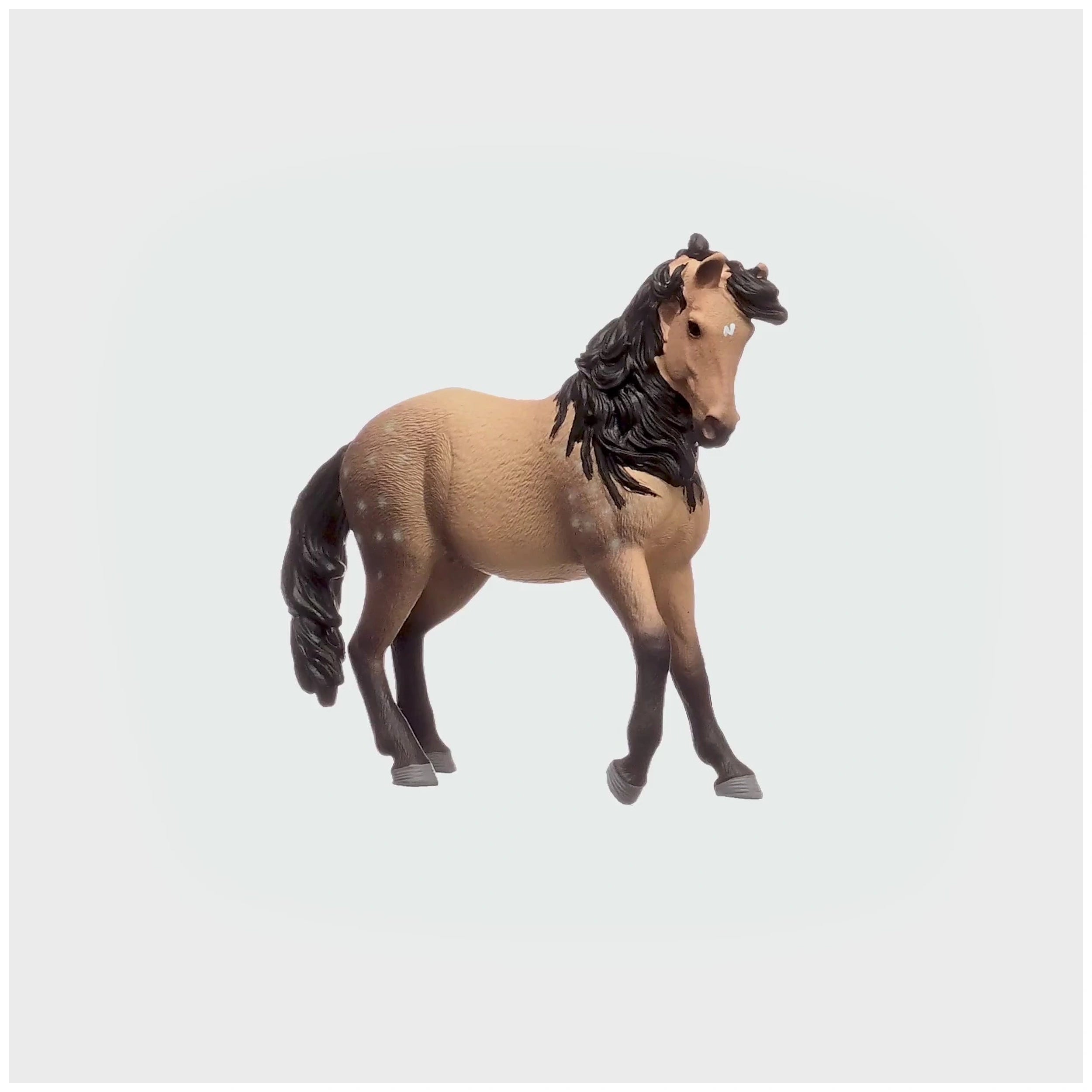 The Andalusian mare is not just a pretty figure; she represents the pinnacle of equestrian excellence. Used to regular training, she excels in the art of dressage, making her an inspiring figure for young horse enthusiasts. Eagerly pawing the sand with her front hoof, she seems to beckon for a training session, embodying the spirit of adventure and the joy of riding. Her pointed ears are pricked up, and her head tilts playfully, inviting children to engage in imaginative play. With her elegant neck and thick bangs falling over her eyes, she is ready to charm anyone who dares to join her in practice.