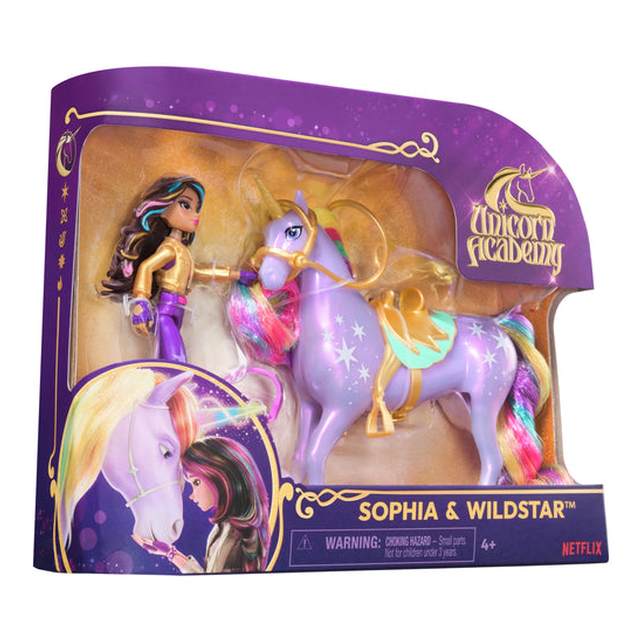 Unicorn Academy Sophia & Wildstar Figuren Set Präsentieren Sie das Unicorn Academy Sophia & Wildstar Figuren Set, ein bezauberndes Spielzeug, das die Magie von Freundschaft und Abenteuer verkörpert. Inspiriert von der beliebten NETFLIX Zeichentrickserie und der Bestsellerbuchreihe, lädt dieses bezaubernde Set Kinder ein, in eine Welt einzutauchen, in der der Fantasie keine Grenzen gesetzt sind. Mit seinem fesselnden Design und den ansprechenden Funktionen ist das Sophia & Wildstar Set perfekt für junge Fans, die die Verbindung zwischen Reiter und Einhorn erkunden möchten. Das Set enthält eine wunderschön gestaltete 11,5 cm große Sophia Puppe, die mit authentischen Details versehen ist, die ihren Charakter aus der Show widerspiegeln. Mit 7 Gelenkpunkten kann Sophia in verschiedenen dynamischen Positionen posiert werden, was kreatives Geschichtenerzählen und Spielen ermöglicht. Ob sie in ein fantastisches Abenteuer reitet oder einfach einen Moment mit ihrem Einhorn genießt, Sophias realistische Merkmale erwecken ihren Charakter zum Leben und machen jede Spielsitzung zu einem aufregenden Erlebnis. An Sophias Seite ist Wildstar, ein atemberaubendes 12,5 cm großes Einhorn, das mit Light Magic-Mustern und einer kämmbaren Regenbogenmähne und -schwanz geschmückt ist. Diese Liebe zum Detail erhöht nicht nur die visuelle Anziehungskraft des Spielzeugs, sondern ermutigt Kinder auch, sich mit Pflege- und Stylingspielen zu beschäftigen, was ein Gefühl von Fürsorge und Verantwortung fördert. Das enthaltene Haarstyling-Werkzeug sorgt dafür, dass Wildstar immer bestens aussieht, bereit für jedes bevorstehende Abenteuer. Das Unicorn Academy Sophia & Wildstar Set kommt außerdem mit abnehmbaren Accessoires, darunter ein Sattel und ein Zaumzeug, die es Sophia ermöglichen, Wildstar sicher zu reiten. Dieses Feature fügt dem Spiel eine zusätzliche Ebene von Realismus hinzu, da Kinder ihre Lieblingsszenen aus der Show nachspielen oder eigene Geschichten erfinden können. Die Vielseitigkeit dieses Sets macht es zu einer fantastischen Ergänzung für jede Spielzeugsammlung und fördert fantasievolles Spielen und Kreativität. Für diejenigen, die ihr Unicorn Academy Erlebnis erweitern möchten, sind zusätzliche Puppen- und Einhornsets erhältlich, die Charaktere wie Ava, Layla, Isabel und Valentina enthalten. Jedes Set wird separat verkauft und bietet endlose Möglichkeiten für Kinder, ihre eigene magische Welt zu erschaffen. Dieser sammelbare Aspekt macht die Unicorn Academy Reihe nicht nur zu einer Quelle der Unterhaltung, sondern auch zu einer Möglichkeit für Kinder, mit Freunden und Familie sozial zu spielen. Zusammenfassend lässt sich sagen, dass das Unicorn Academy Sophia & Wildstar Figuren Set mehr als nur ein Spielzeug ist; es ist eine Einladung, eine Welt voller Freundschaft, Abenteuer und Kreativität zu erkunden. Perfekt für Geburtstage oder besondere Anlässe, wird dieses Set junge Einhorn-Enthusiasten begeistern. Verpassen Sie nicht die Gelegenheit, die Magie der Unicorn Academy nach Hause zu bringen – bestellen Sie Ihr Set noch heute und lassen Sie die Abenteuer beginnen!