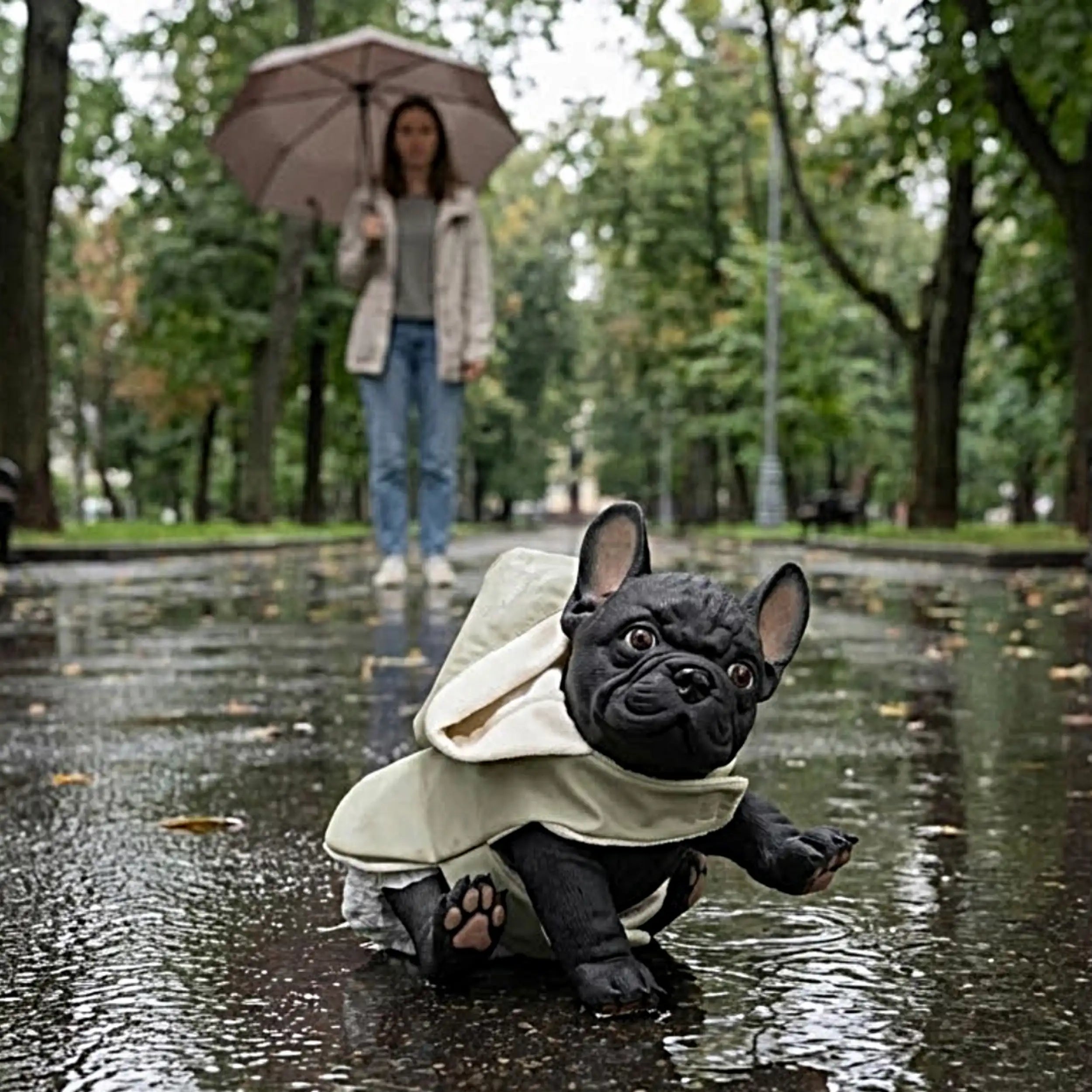 French Bulldog doll wearing a green raincoat, sitting with one paw raised.