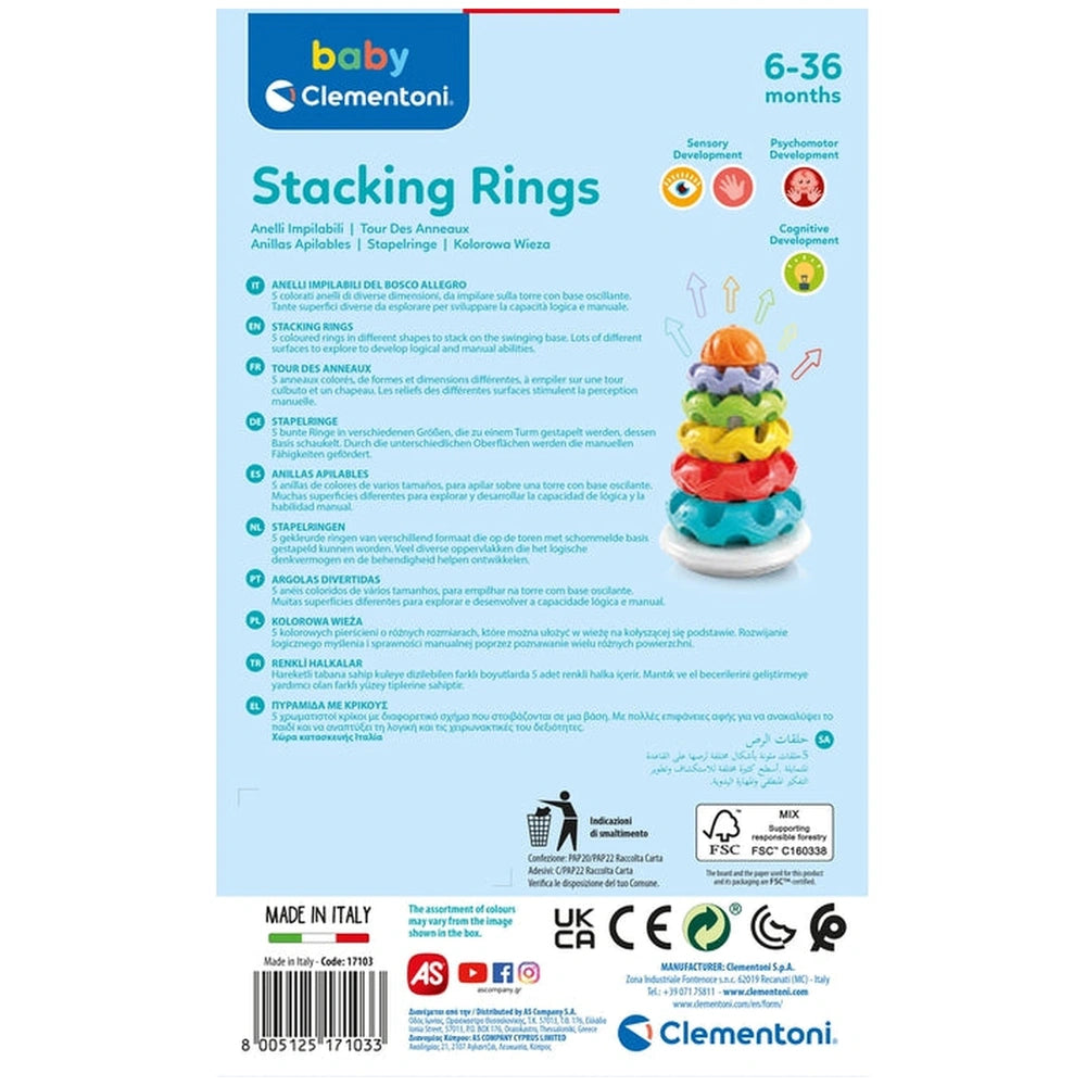 In conclusion, the Baby Clementoni - Stacking Rings Baby Activity Toys is an ideal choice for parents seeking a fun, educational, and safe toy for their infants. With its focus on sensory exploration, motor skill development, and cognitive growth, this toy is a must-have for any playroom. Don’t miss the opportunity to enrich your child’s playtime experience—order the Baby Clementoni Stacking Rings today and watch as your little one learns and grows through play!
