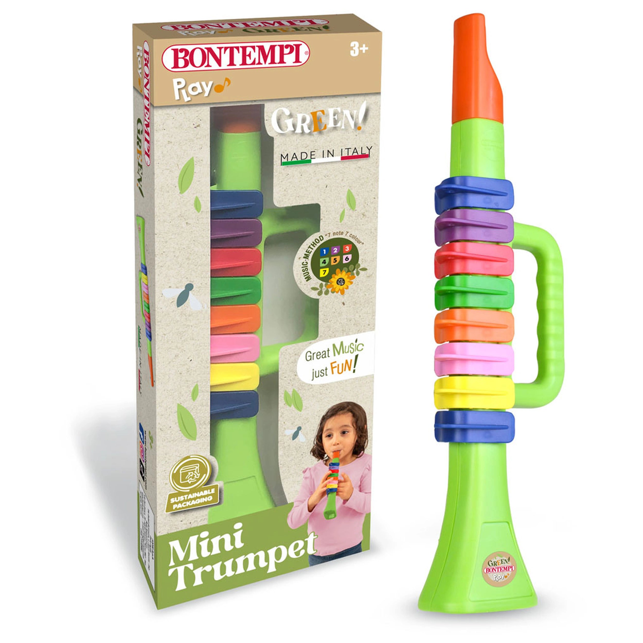 Introducing the Bontempi Mini Trumpet in a vibrant green hue, a delightful addition to any young musician's collection of musical instruments. This charming mini trumpet is designed specifically for children, featuring eight colorful keys that not only enhance the visual appeal but also make learning music an engaging experience. With a length of 270 mm, it is perfectly sized for small hands, ensuring that your child can easily grasp and play it with confidence.