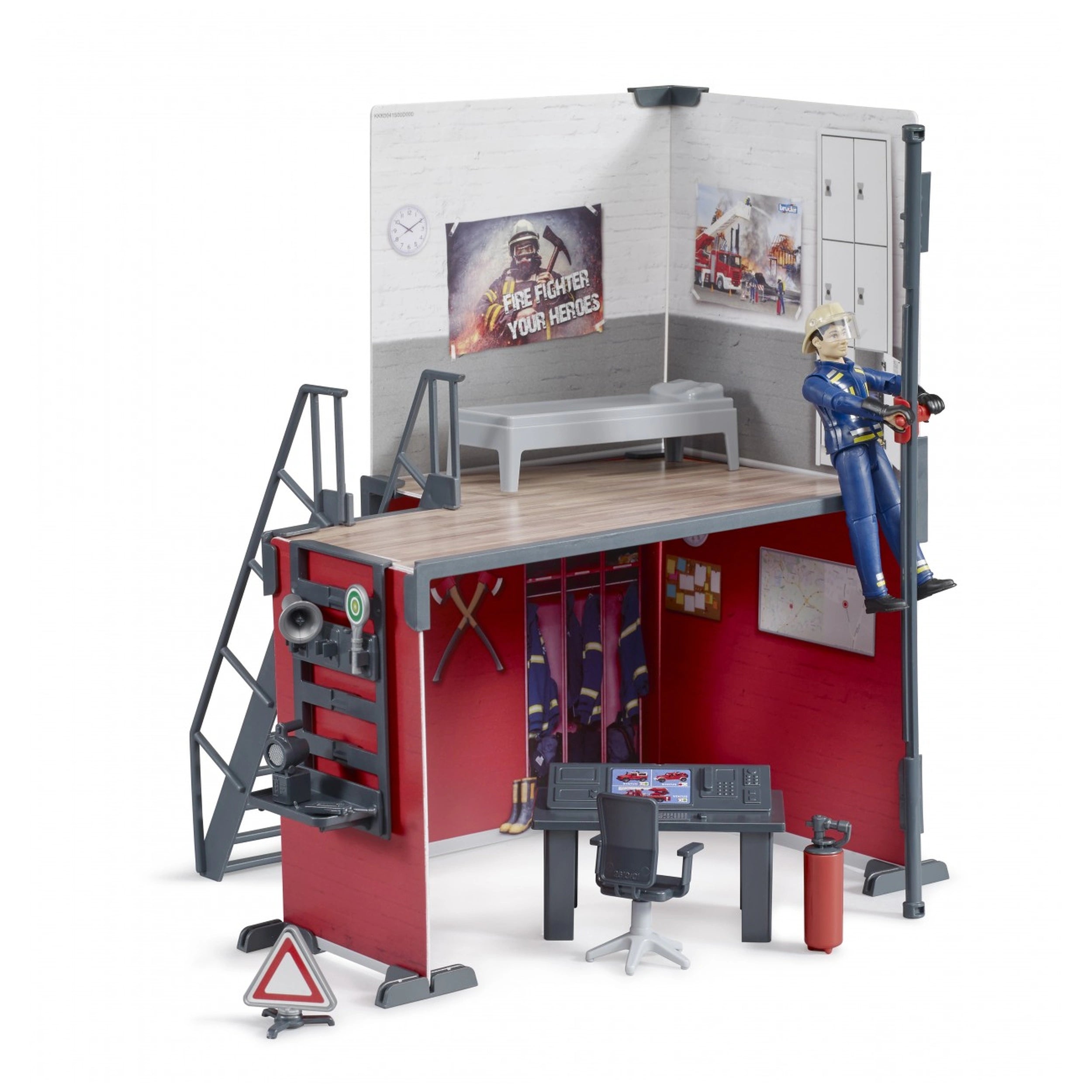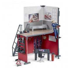 The bworld Fire Station is designed to be easily combined with other bworld themed sets, expanding the possibilities for imaginative play. Children can integrate this fire station with various vehicles and accessories from the Bruder collection, creating a comprehensive play environment that reflects the complexities of real-world firefighting operations. The double-sided printed units with stands and wall racks with shelves enhance the station's functionality, providing ample space for organizing equipment and supplies.