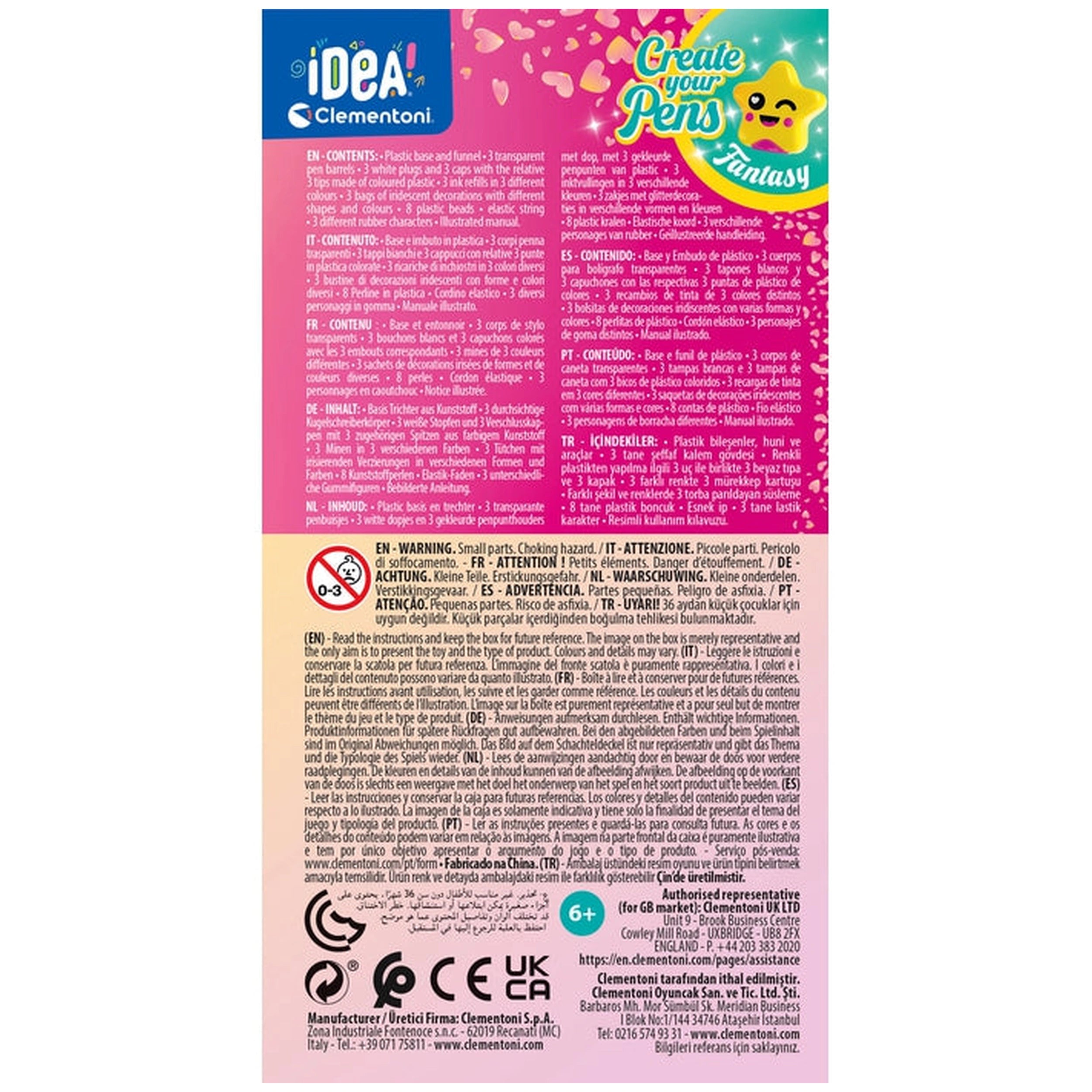 Introducing the Clementoni - IDEA Create your Pens Fantasy, a unique and engaging arts and crafts kit designed to inspire creativity in children aged six and up. This innovative product allows young artists to assemble and personalize three pens, transforming them into magical writing instruments adorned with various fantasy-themed decorations. With its focus on imaginative play, this kit encourages children to express themselves while developing fine motor skills and artistic abilities.
