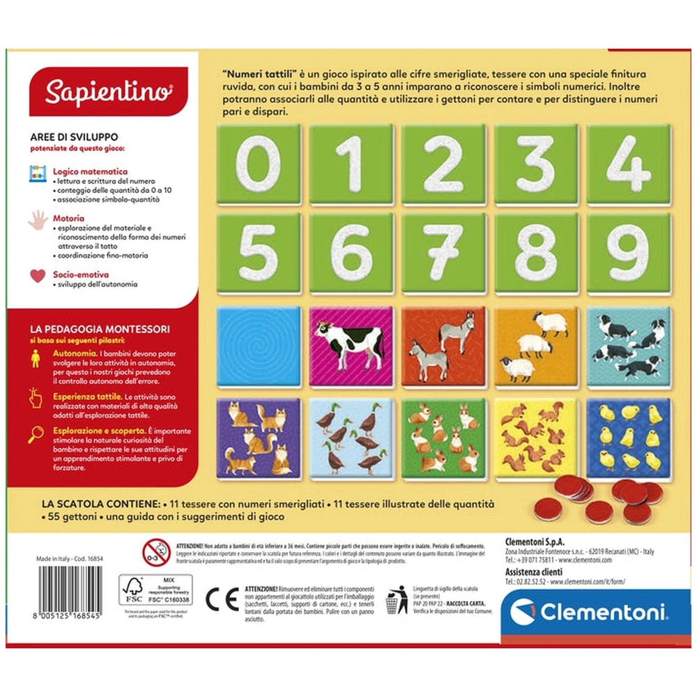 Introducing the Clementoni Sparientino - Montessori Numeri Tattili, an innovative educational toy designed to enhance tactile perception and numerical understanding in young children. This Italian edition of the popular Montessori method encourages children aged 3 to 5 to explore the world of numbers through engaging, hands-on play. With a focus on sensory learning, this game provides a unique opportunity for children to develop essential skills while having fun.