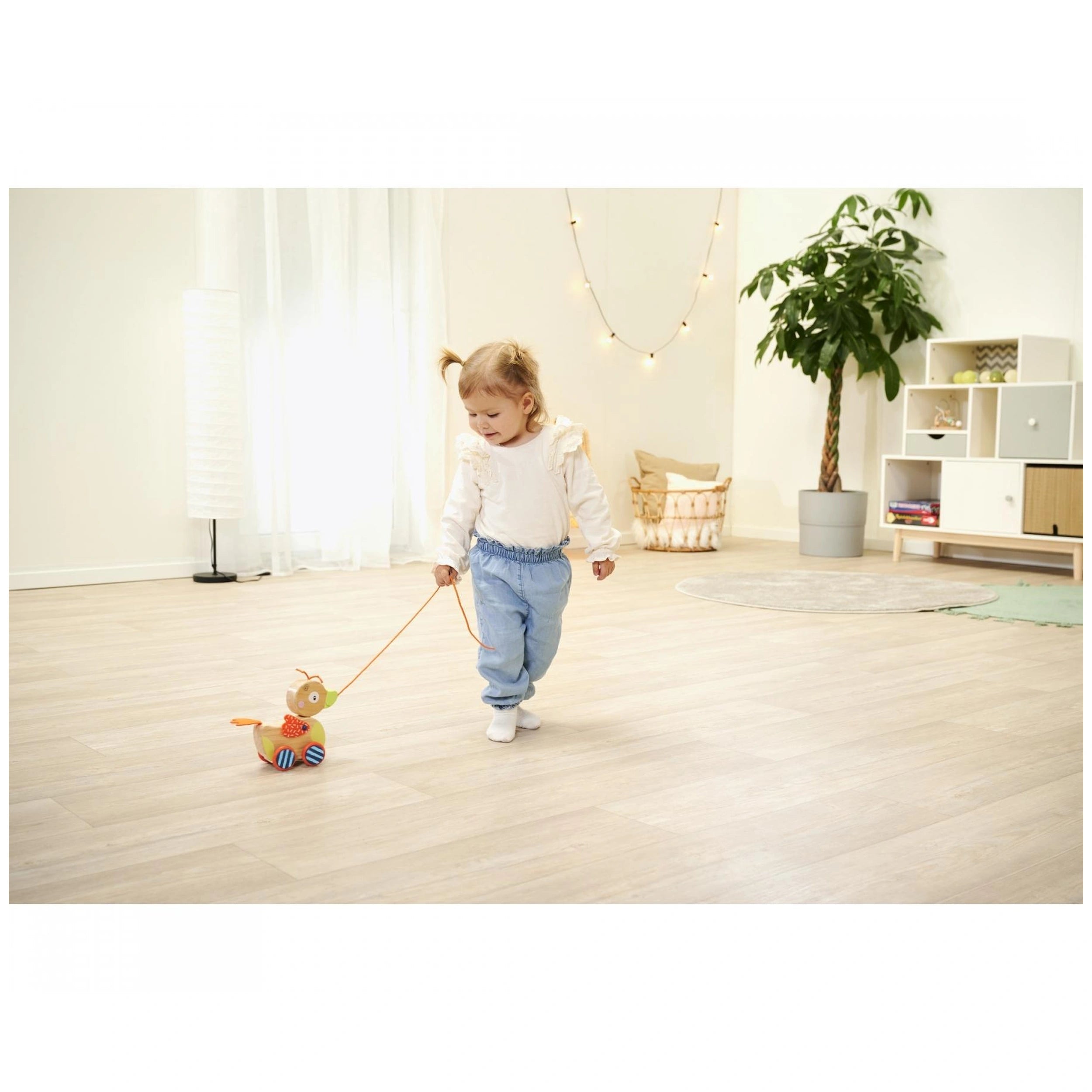 Crafted from high-quality birch wood sourced from FSC-certified forests, this pull-along duck is not only sturdy but also environmentally friendly. The toy's design includes a string for easy pulling, allowing children to take their new feathered friend on adventures around the house or yard. As they pull the duck along, it emits delightful quacking sounds, adding an auditory element that enhances the play experience. The head and wings of the duck move in sync with its wheels, creating a lively and interactive playtime scenario that keeps toddlers engaged.