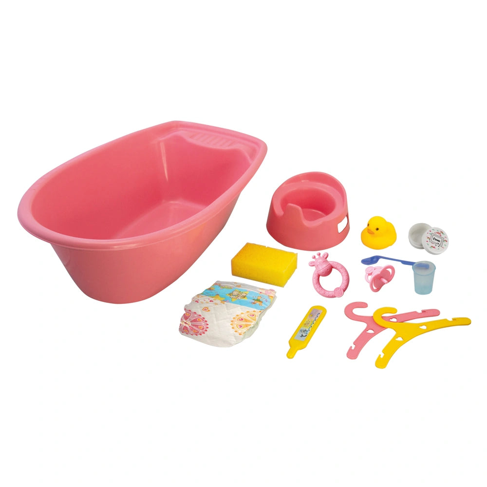 This doll bathtub set includes a bathtub measuring approximately 51 x 27.5 x 16 cm, along with a variety of accessories such as a sponge, bath thermometer, potty, doll diaper, comb, cream tin, spoon, measuring cup, two hangers, bath duck, rattle, and pacifier. Many components are made in Germany, ensuring quality and safety. The design promotes interactive play, allowing children to engage in realistic bathing routines with their dolls, enhancing their creativity and social skills.