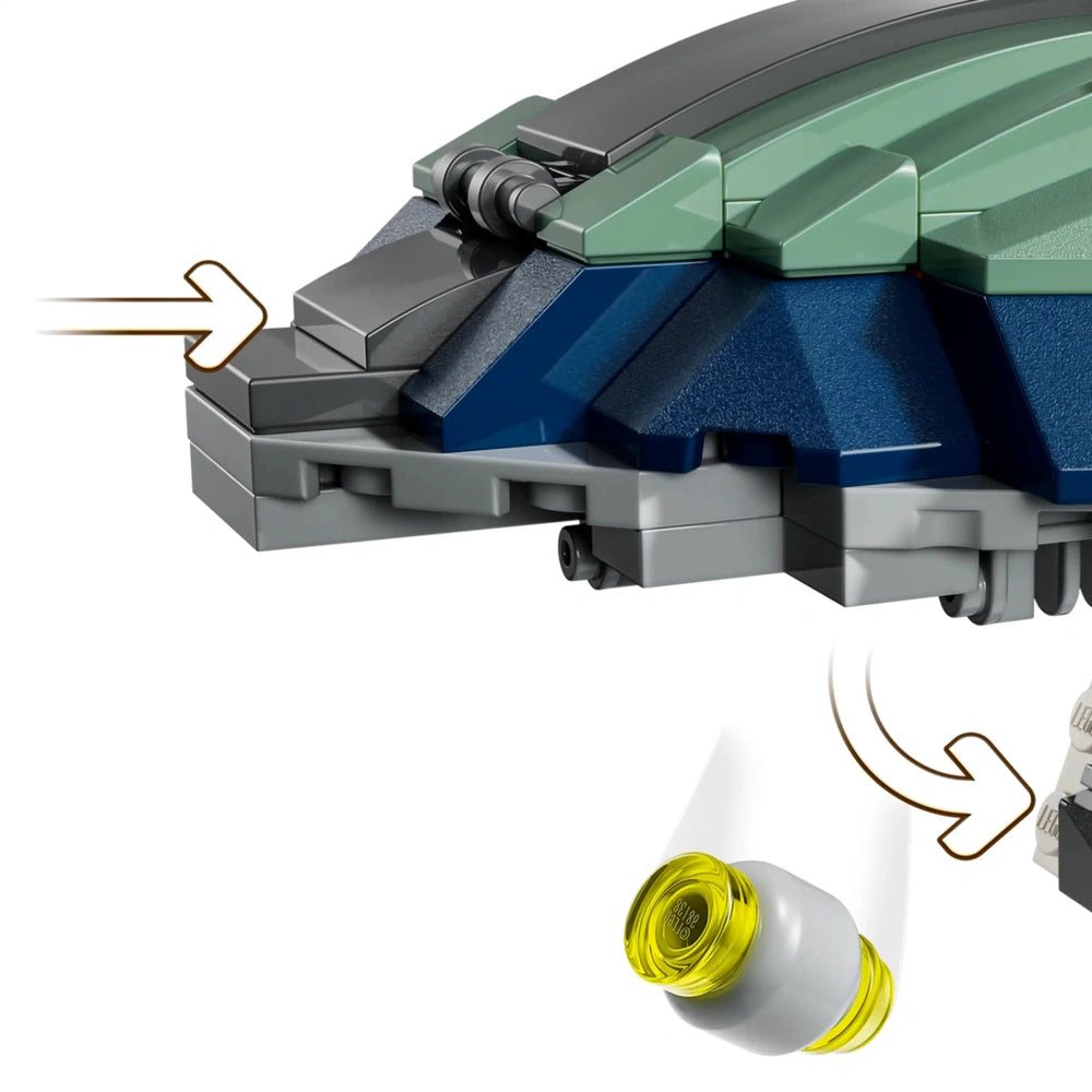 The centerpiece of this set is Jango Fett's starship, a stunning replica that boasts an array of interactive elements. The starship includes a spacious cockpit that accommodates two LEGO minifigures, allowing for dynamic role-playing scenarios. Equipped with four stud shooters and a seismic charge-dropping function, this starship is ready for action-packed missions. The wings are designed to rotate with gravity, adding a realistic touch to the building experience and enhancing the overall playability of the set.