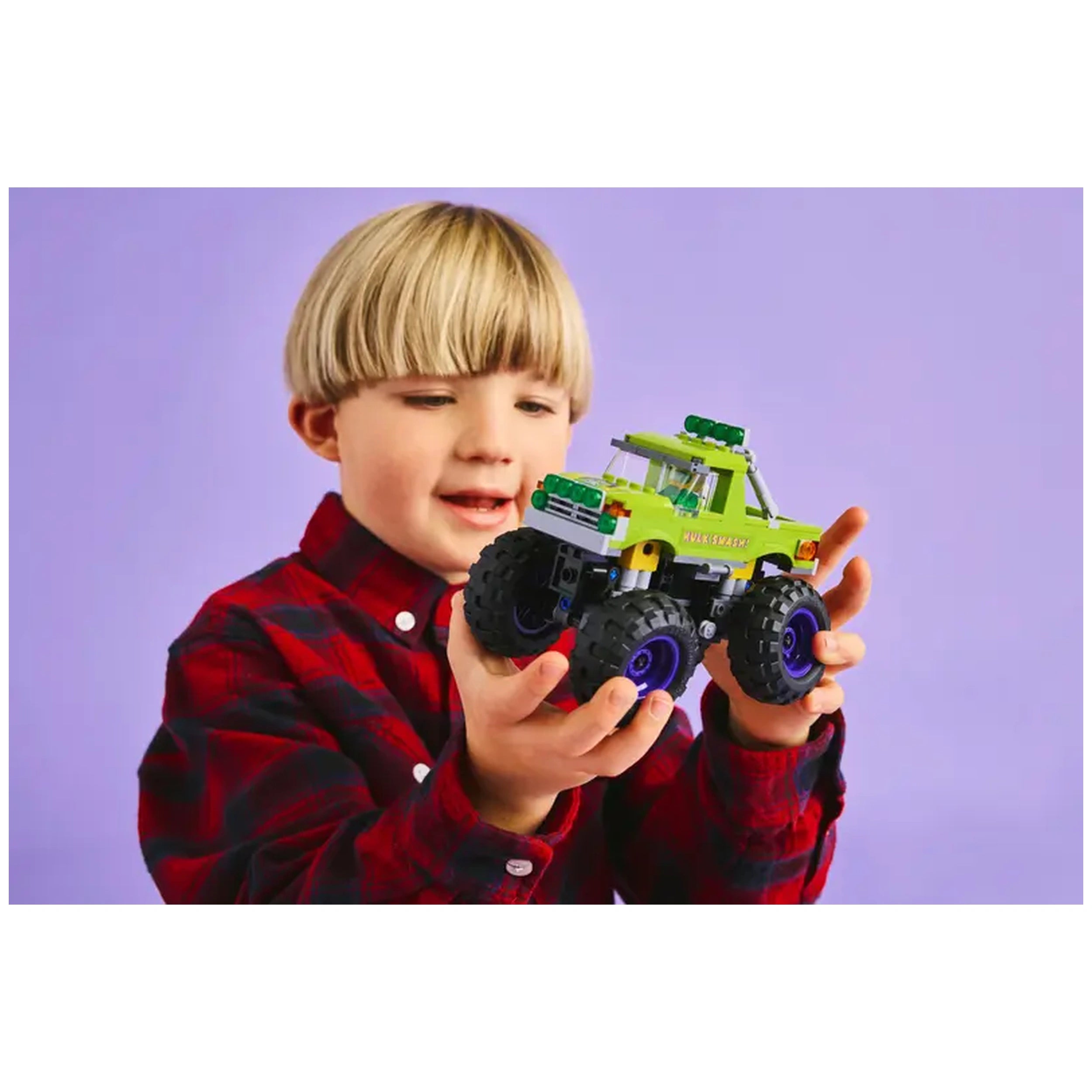 The centerpiece of this set is the Hulk's heavy-duty truck, a robust vehicle that embodies the strength and power of the Hulk himself. The truck features a striking green exterior adorned with the phrase "Hulk Smash!" and a detailed depiction of Hulk's face, making it a standout addition to any LEGO collection. The truck's design includes large turning wheels and a shock-absorbing suspension system, ensuring it can tackle any off-road adventure your child can imagine. With a lift-off cab, kids can easily access the driver’s seat, where they can place the included Hulk minifigure, complete with a removable helmet.