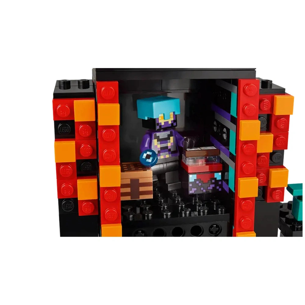 The centerpiece of this construction set is the impressive Enderman-shaped tower, complete with a Nether portal nestled within its head. This striking design features balconies on each shoulder and two fully furnished rooms that include a crafting table, an enchanting table, and a storage box for Ender pearls. The thoughtful arrangement of ladders allows easy access to the tower's upper levels, while the posable arms add an interactive element that enhances the play experience. Outside, builders will find elements inspired by the warped forest and crimson forest biomes, bringing the Minecraft world to life in a tangible way.