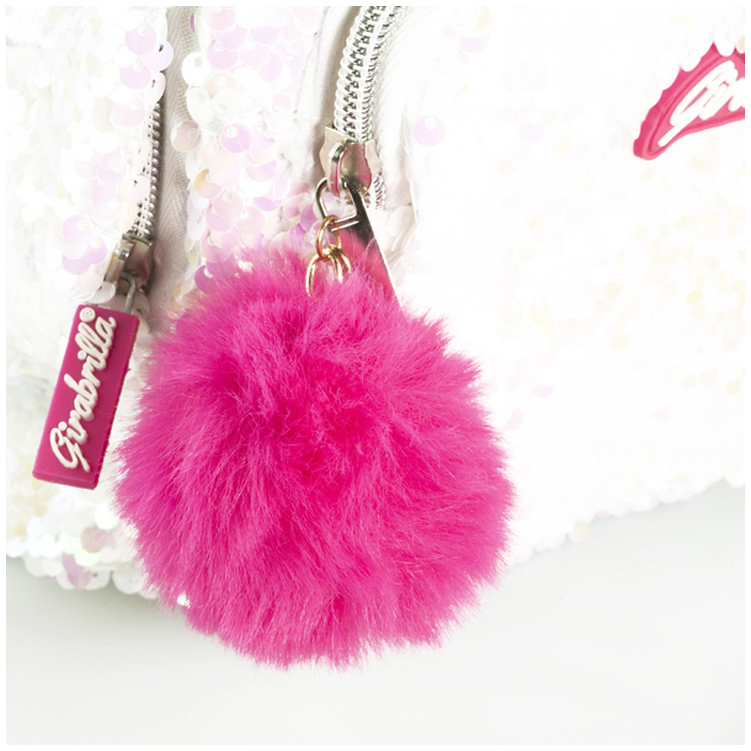 The backpack features two zippered pockets: a roomy main compartment and a convenient front pocket. The front pocket is adorned with a matching pom-pom, adding an extra touch of whimsy to the overall design. This thoughtful layout allows for easy organization, making it simple for children to access their belongings quickly. Additionally, the backpack includes a sturdy handle for easy one-handed carrying, making it a breeze for kids to grab and go.