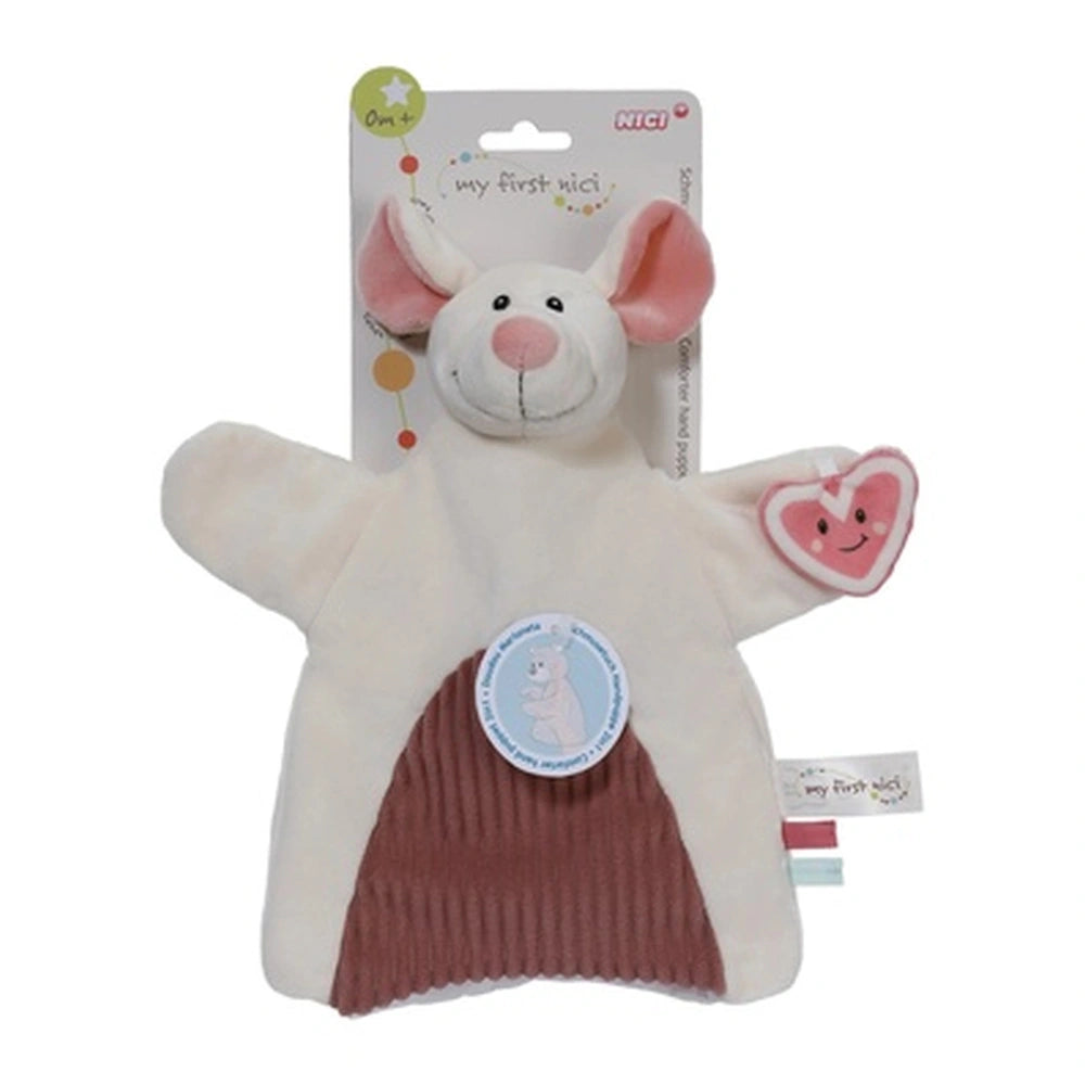 Introducing the NICI My First 2-in-1 Mouse Hand Puppet and Cuddle Blanket, a delightful companion designed to accompany your little one on their early adventures. This charming product combines the warmth of a cuddle blanket with the imaginative play of a hand puppet, making it an essential addition to any baby's collection. Crafted with care, the NICI Mouse features a soft, cream-colored plush fabric adorned with playful pink accents, ensuring it is not only visually appealing but also incredibly comforting for infants.