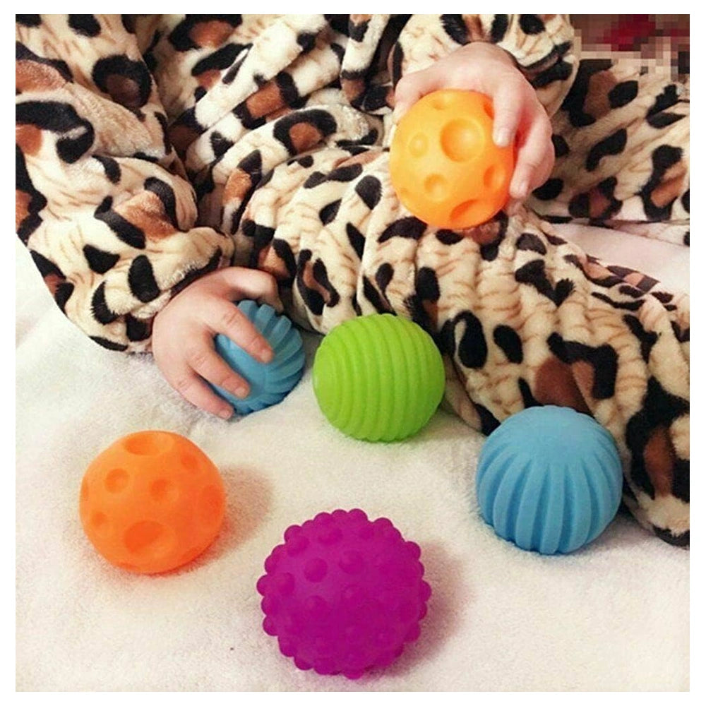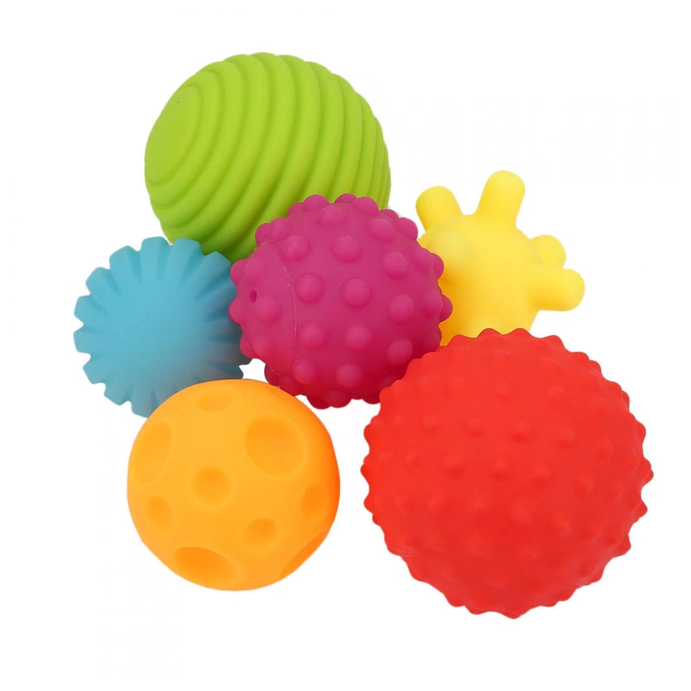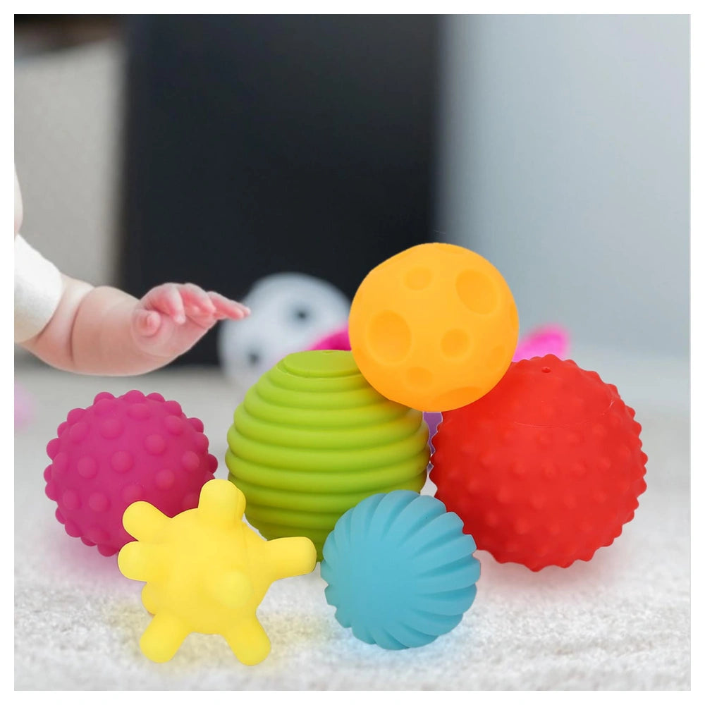 Part of the Opplà developmental line by ODS Toys, this set includes 6 uniquely textured soft balls in bright, stimulating colors. Each ball is perfectly sized and weighted for small hands to grasp and hold, encouraging independent exploration. The diverse surface patterns—from smooth ridges to soft spikes and craters—offer a range of tactile experiences, while a gentle squeaking sound when squeezed stimulates auditory development.