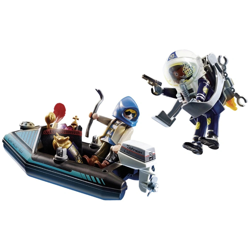 Included in the set is a realistic inflatable boat complete with an outboard motor, which the thief uses to make his getaway. The boat is designed to float, adding an extra layer of fun during playtime, especially during water-themed adventures. Children can easily envision the high-speed chase as the police officer navigates the skies above while the thief tries to escape on the water. This engaging scenario promotes active play and storytelling, making it a perfect addition to any child's toy collection.