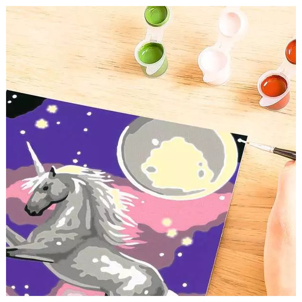 The Starry Unicorn kit is part of the special CreArt Kids - Color Lines series, featuring colored borders that guide young painters toward achieving a perfect result. Measuring 14 x 19 cm, the high-quality painting board is perfectly sized for small hands, enabling children to develop precision and control as they paint. This set is designed for immediate use, containing all essential tools needed to start creating a masterpiece right out of the box. As colors are applied, the enchanting unicorn image takes shape, instilling a deep sense of pride in the young artist's creative achievement.
