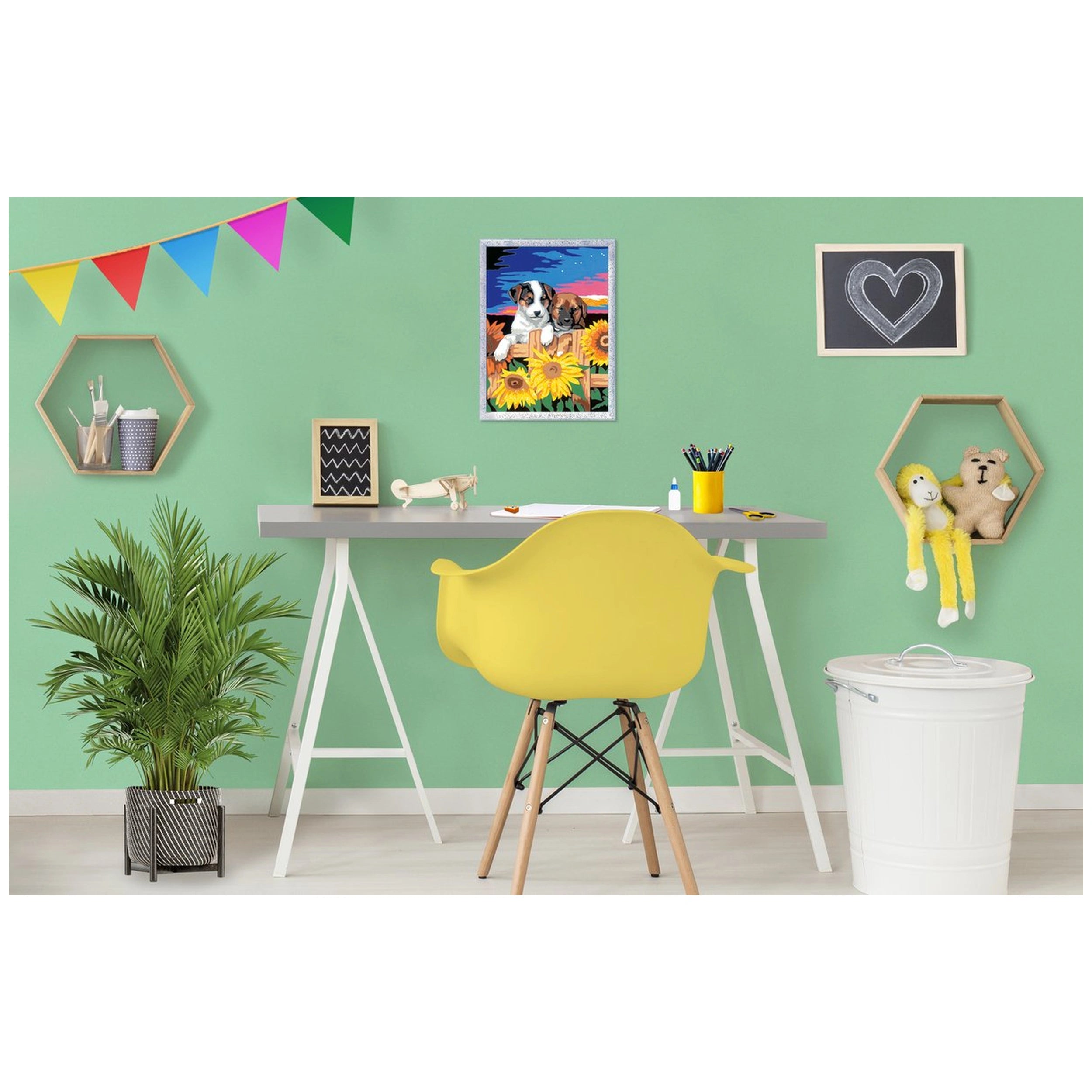 The CreArt Sunset Paw-Fection set includes everything you need to create a beautiful masterpiece. Inside the box, you will find high-quality, water-based acrylic paints in individually numbered jars, ensuring that you have the right color for each section of your painting. The set also comes with a pre-printed canvas featuring the enchanting sunset and paw design, a brush for applying the paint, and a palette to keep your workspace organized. Once completed, your artwork can be elegantly displayed in the included frame, adding a touch of charm to any room.