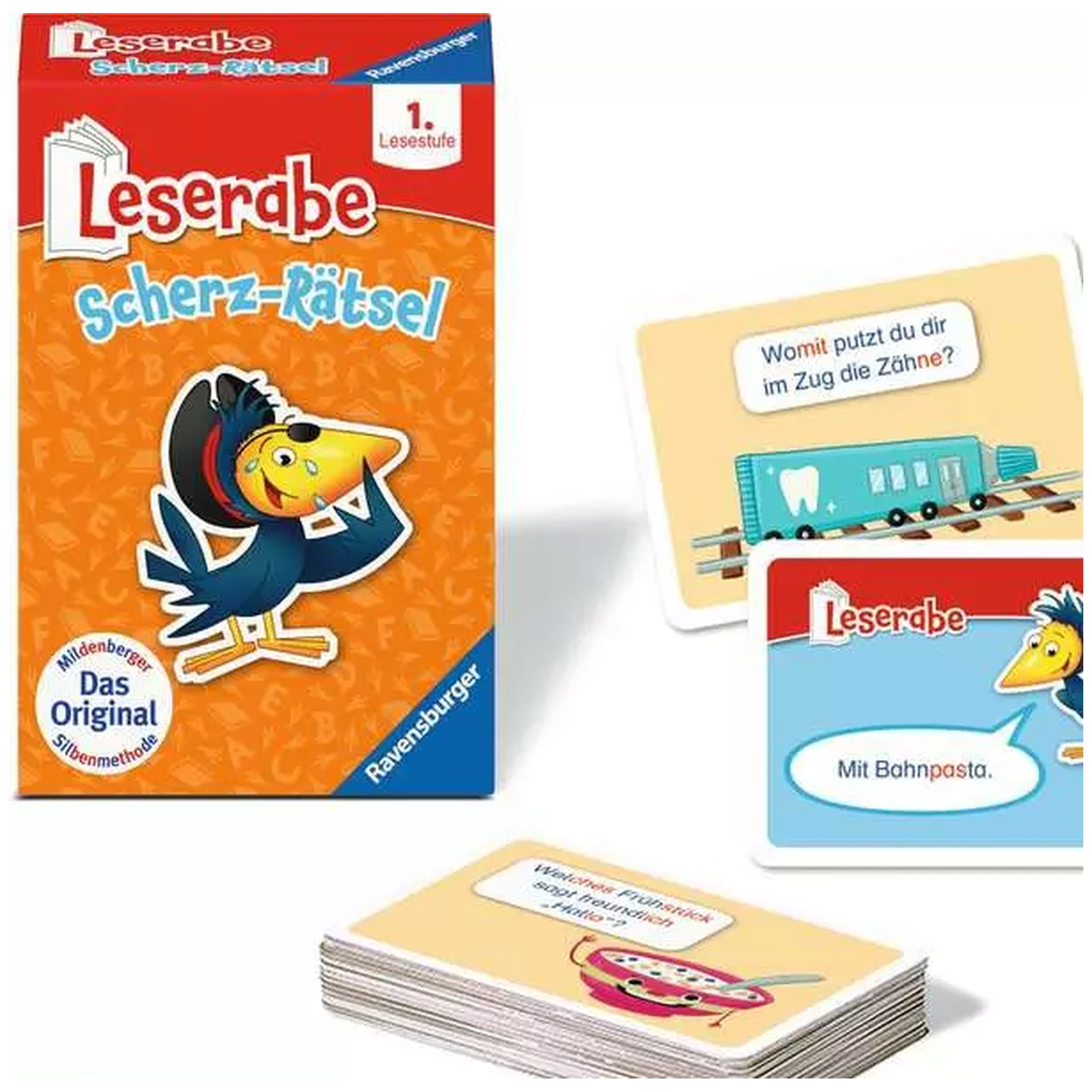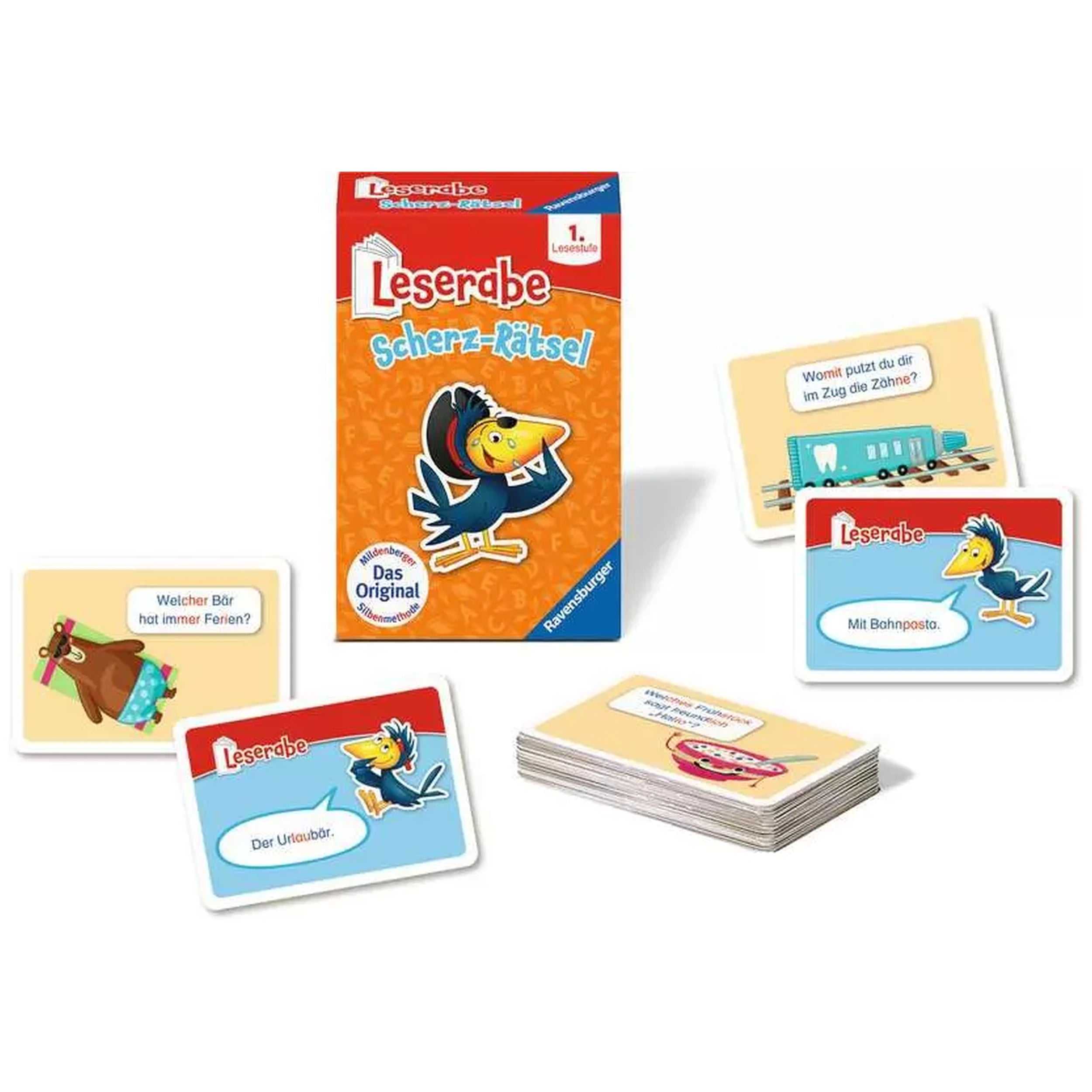 Introducing the Ravensburger - Leserabe: Scherz-Rätsel Card Game, a delightful educational tool designed to make reading an enjoyable experience for children. This engaging card game is specifically tailored for first graders, providing a fun and interactive way to enhance their reading skills. With its vibrant illustrations and captivating content, the Leserabe is perfect for both home use and on-the-go entertainment, ensuring that learning never feels like a chore.