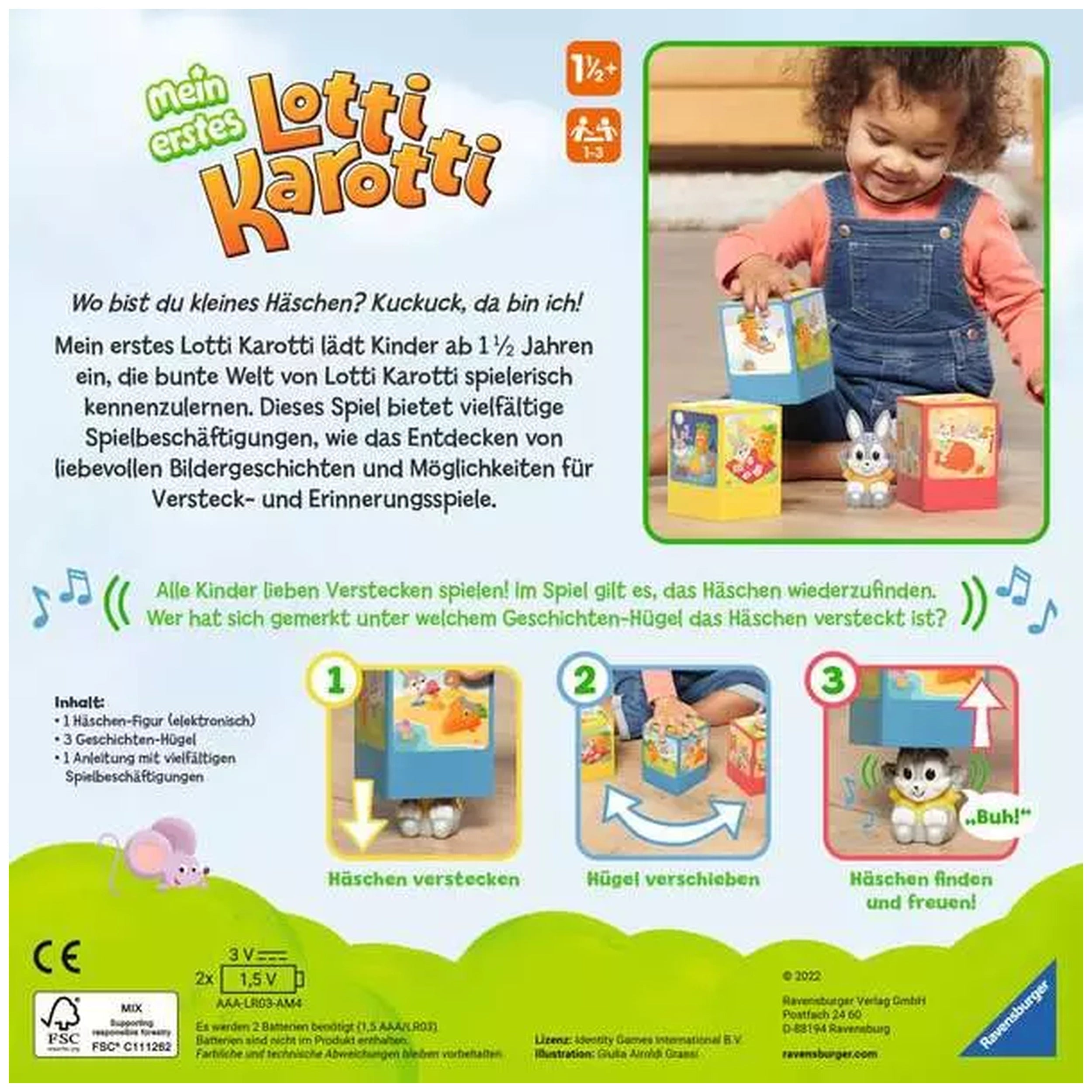 Introducing the Ravensburger - Mein erstes Lotti Karotti, an engaging baby activity toy designed specifically for children aged 1½ years and older. This delightful game introduces the youngest players to the world of interactive play, encouraging memory skills and cognitive development in a fun and entertaining way. With its charming design and electronic features, it promises to be a favorite among toddlers and parents alike.