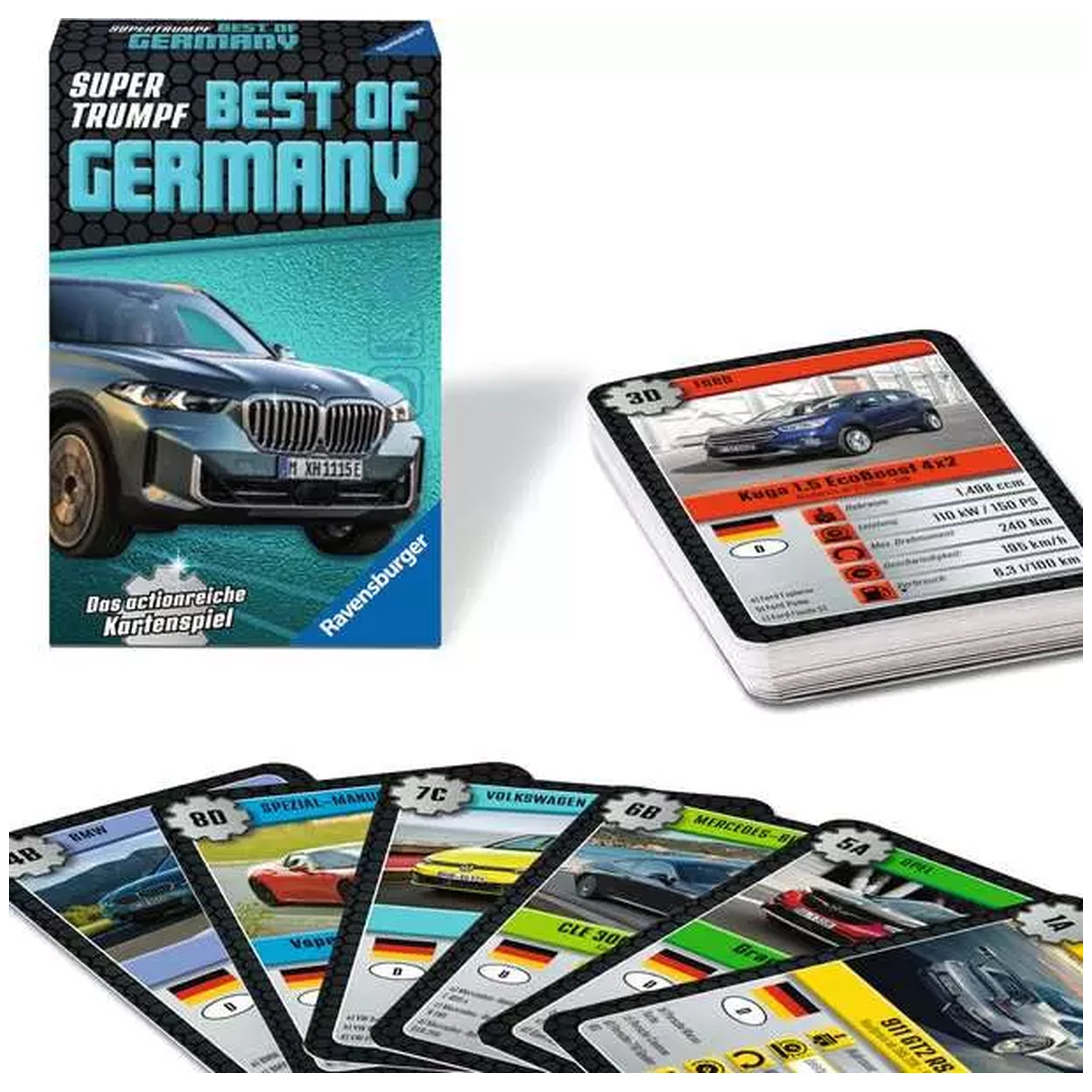 Introducing the Ravensburger - Supertrump Best Of Germany - Board Game, a captivating card game designed for enthusiasts aged seven and above. This German edition of Supertrump offers an engaging blend of fun and education, making it the perfect gift for young players and adults alike. With its focus on automobiles and technology, this game is sure to thrill anyone with a passion for cars, providing an exciting way to learn about various models and their specifications.