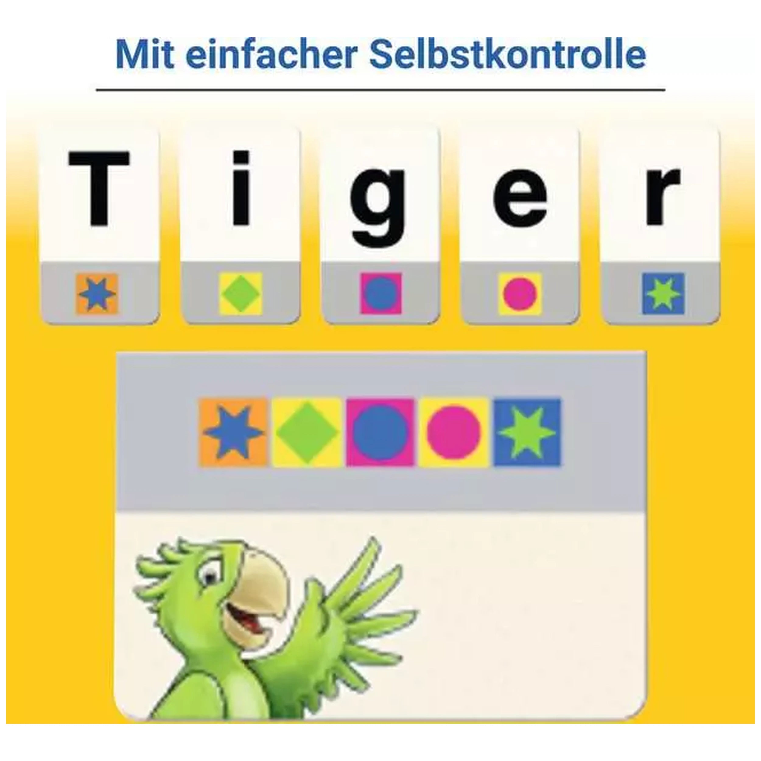 In "Wort für Wort," children embark on a playful journey where they read, write, and spell various words. The game features a cheeky parrot on a spinning wheel that indicates how many letters players can use to create words that match the images on the game cards. For instance, players will learn how to spell words like "Pirat" while enjoying the thrill of competition. The game encourages self-checking, as children can verify the correctness of their spelling by flipping over the cards to reveal the answers.