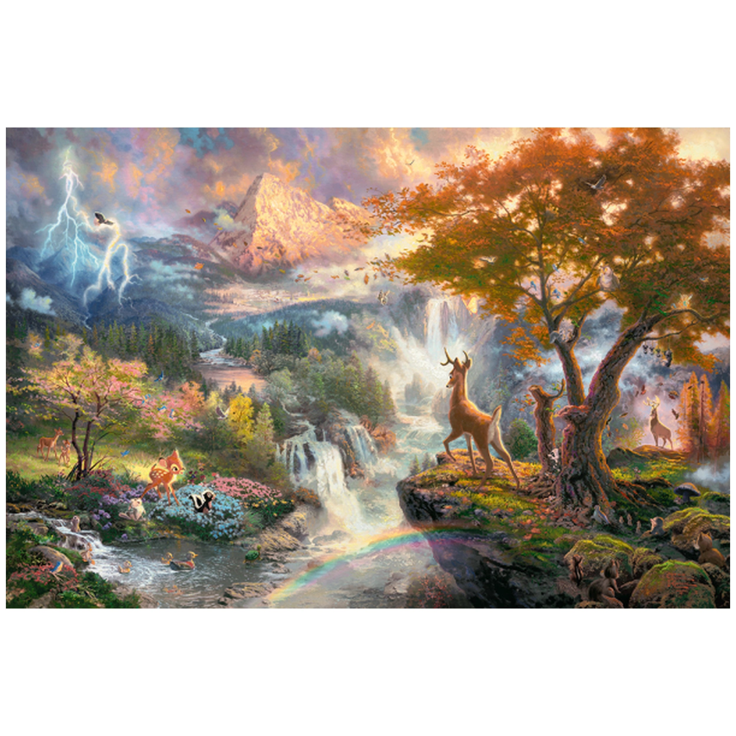 Introducing the Schmidt Spiele - Bambi 1000 Pcs Puzzle, a delightful journey into the heart of the forest that captures the essence of Disney's beloved classic. This exquisite jigsaw puzzle features the enchanting artistry of Thomas Kinkade, renowned for his ability to infuse warmth and light into his works. With 1000 intricately designed pieces, this puzzle invites you to immerse yourself in a vibrant woodland scene where Bambi and his friends come to life amidst cascading waterfalls and a breathtaking sky. Each piece is a step closer to recreating a moment filled with nostalgia and wonder.