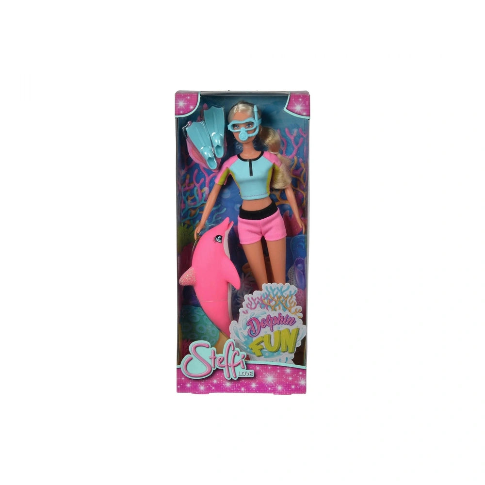 Introducing the Simba - Steffi LOVE Dolphin Fun, a delightful playset that invites children into the enchanting world of underwater exploration. This charming set features Steffi, a fashionable doll who is ready to dive into exciting adventures beneath the waves. With her stylish diving suit, goggles, and swimming fins, Steffi is perfectly equipped for her aquatic escapades. Accompanying her is a playful pink dolphin, adding an extra layer of fun and imagination to playtime.