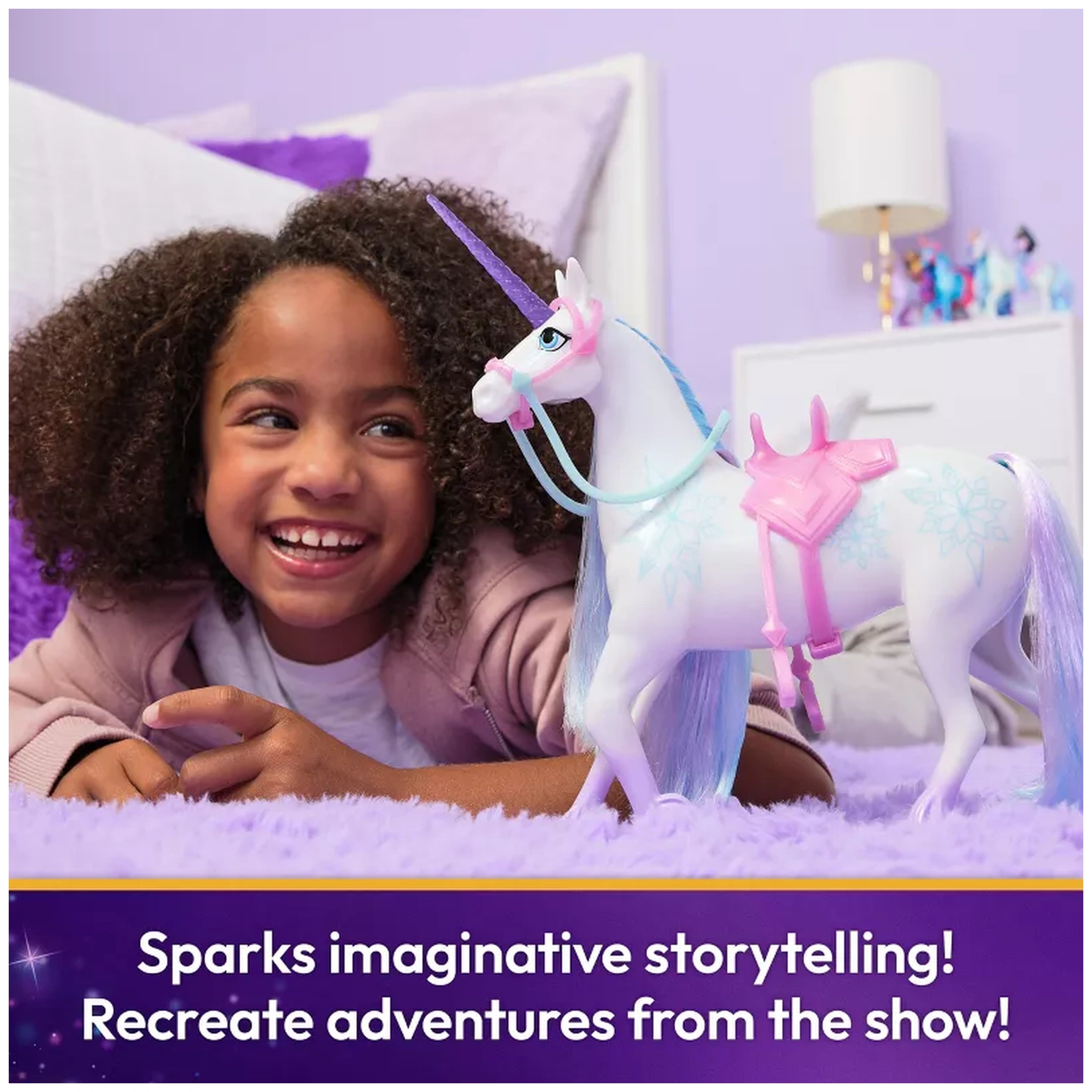 Glacier features a stunning pearlized body adorned with intricate snowflake Ice Magic markings, reflecting her unique personality. Her majestic glittery horn and vibrant mane and tail add to her charm, making her a standout piece in any Unicorn Academy collection. The attention to detail ensures that Glacier looks just like her on-screen counterpart, allowing children to immerse themselves in the magical world of Unicorn Academy as they play.
